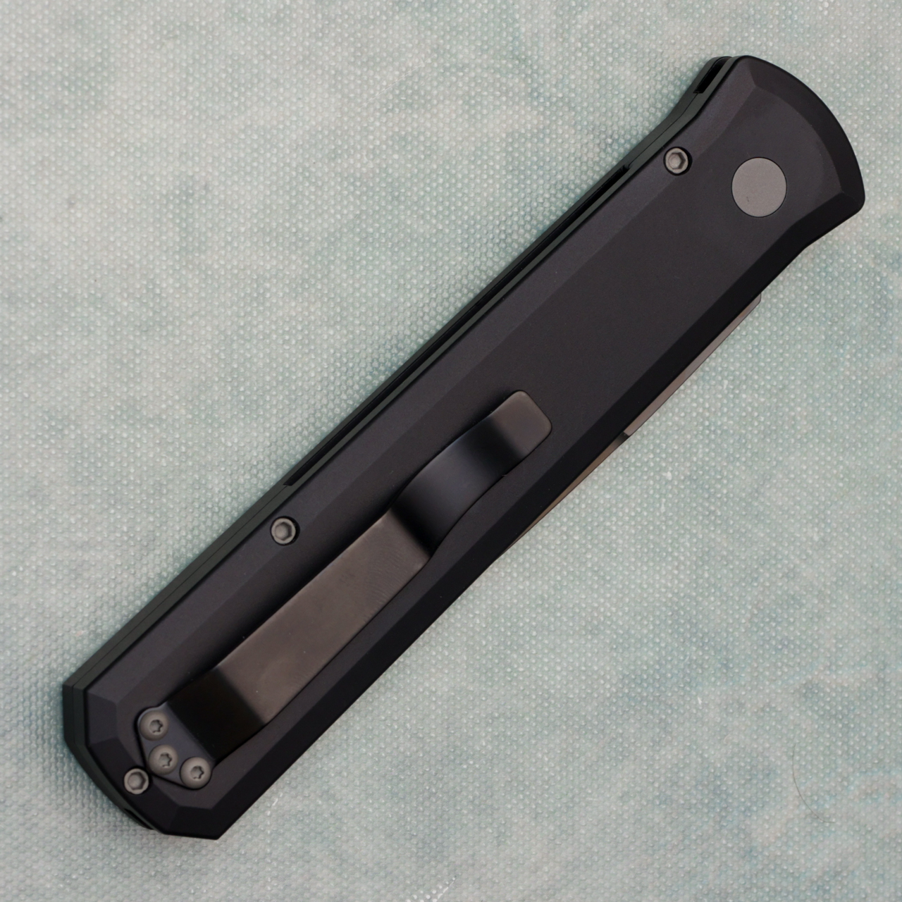 This model features solid black anodized 6061-T6 aluminum handle scales. Smoky Grey DLC finished 154-CM stainless steel bayonet style spear point blade. Bead blast finished hardware. The blade is marked with the Pro-Tech logo and model information. Brand new in box.