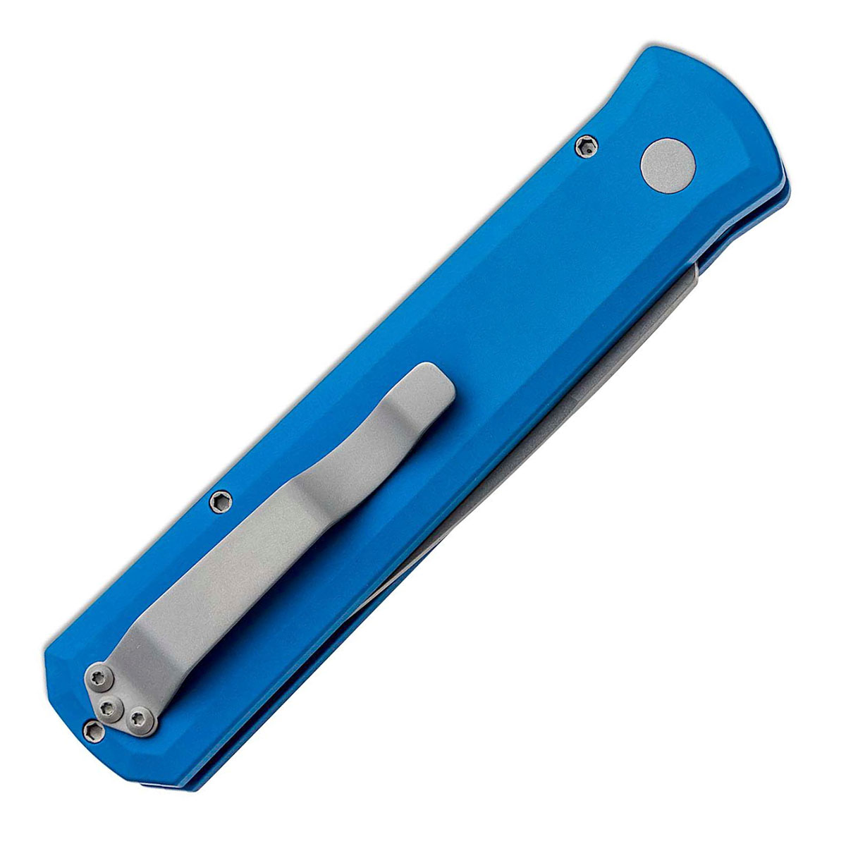 This model features solid blue anodized 6061-T6 aluminum handle scales. Bead blast finished 154-CM stainless steel bayonet style spear point blade. Bead blast finished finished hardware and pocket clip. The blade is marked with the Pro-Tech logo and model information. Brand new in box.