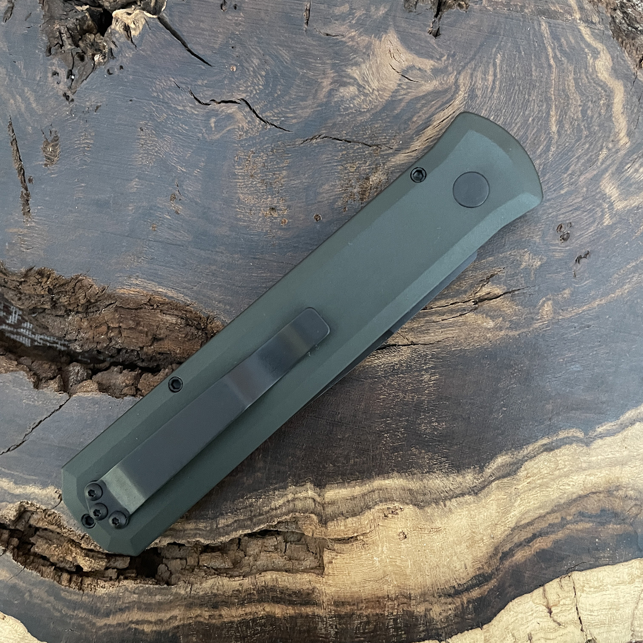 This model features solid green anodized 6061-T6 aluminum handle scales. Black finished 154-CM stainless steel bayonet style spear point blade. The blade is marked with the Pro-Tech logo and model information. Brand new in box.