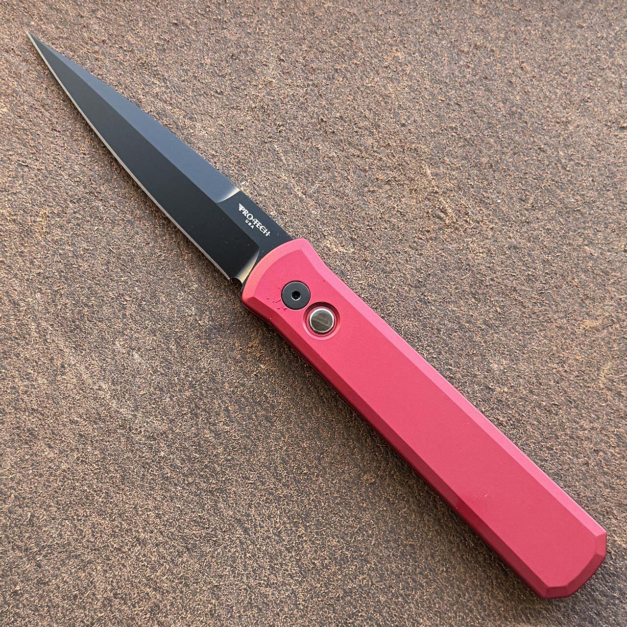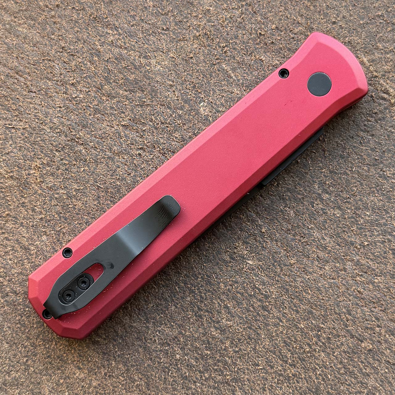 This model features solid red anodized 6061-T6 aluminum handle scales. DLC finished 154-CM stainless steel bayonet style spear point blade. DLC finished hardware and pocket clip. Black lip pearl button. The blade is marked with the Pro-Tech logo and model information. Brand new in box.