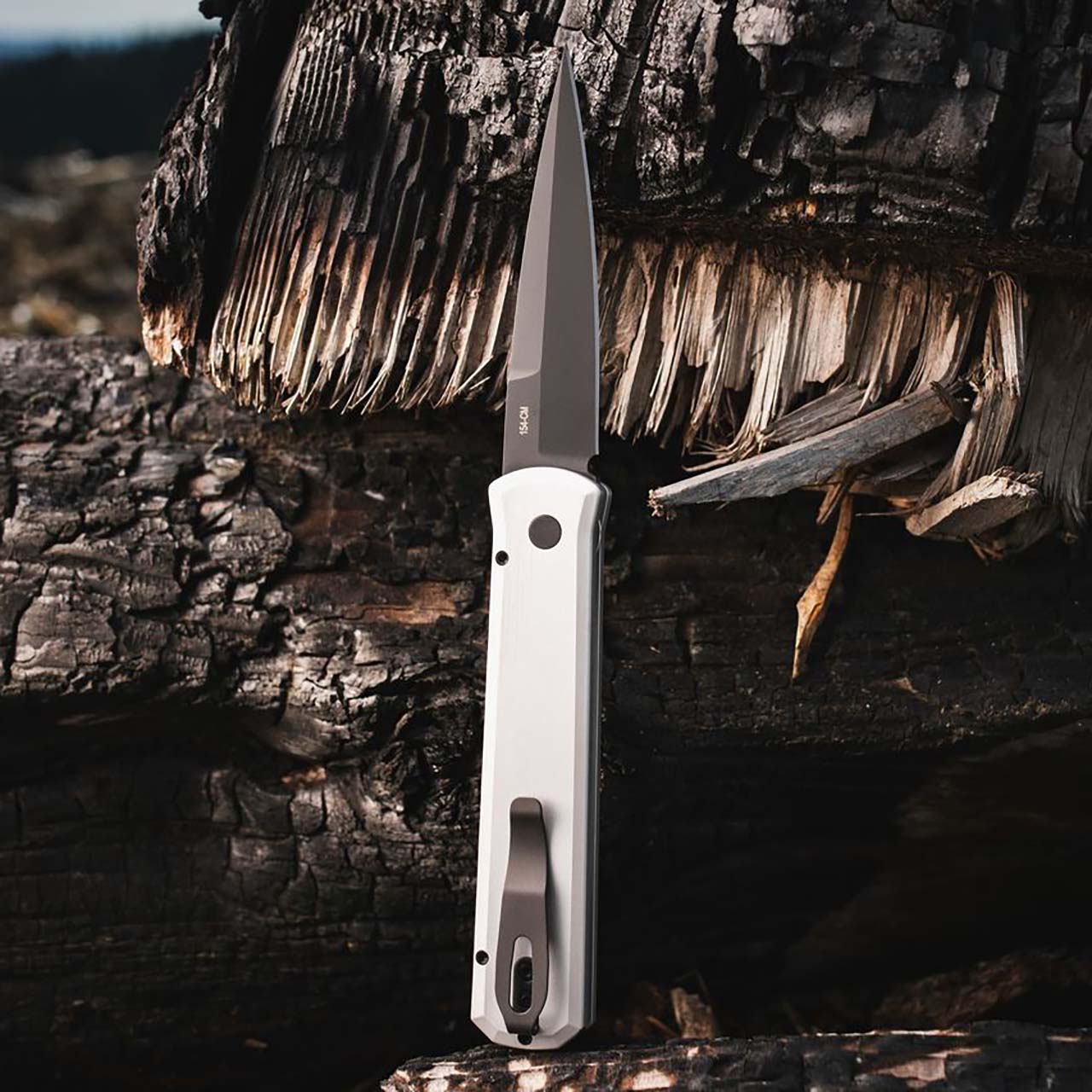 This model features solid silver anodized 6061-T6 aluminum handle scales. DLC finished 154-CM stainless steel bayonet style spear point blade. DLC finished hardware and pocket clip The blade is marked with the Pro-Tech logo and model information. Brand new in box.
