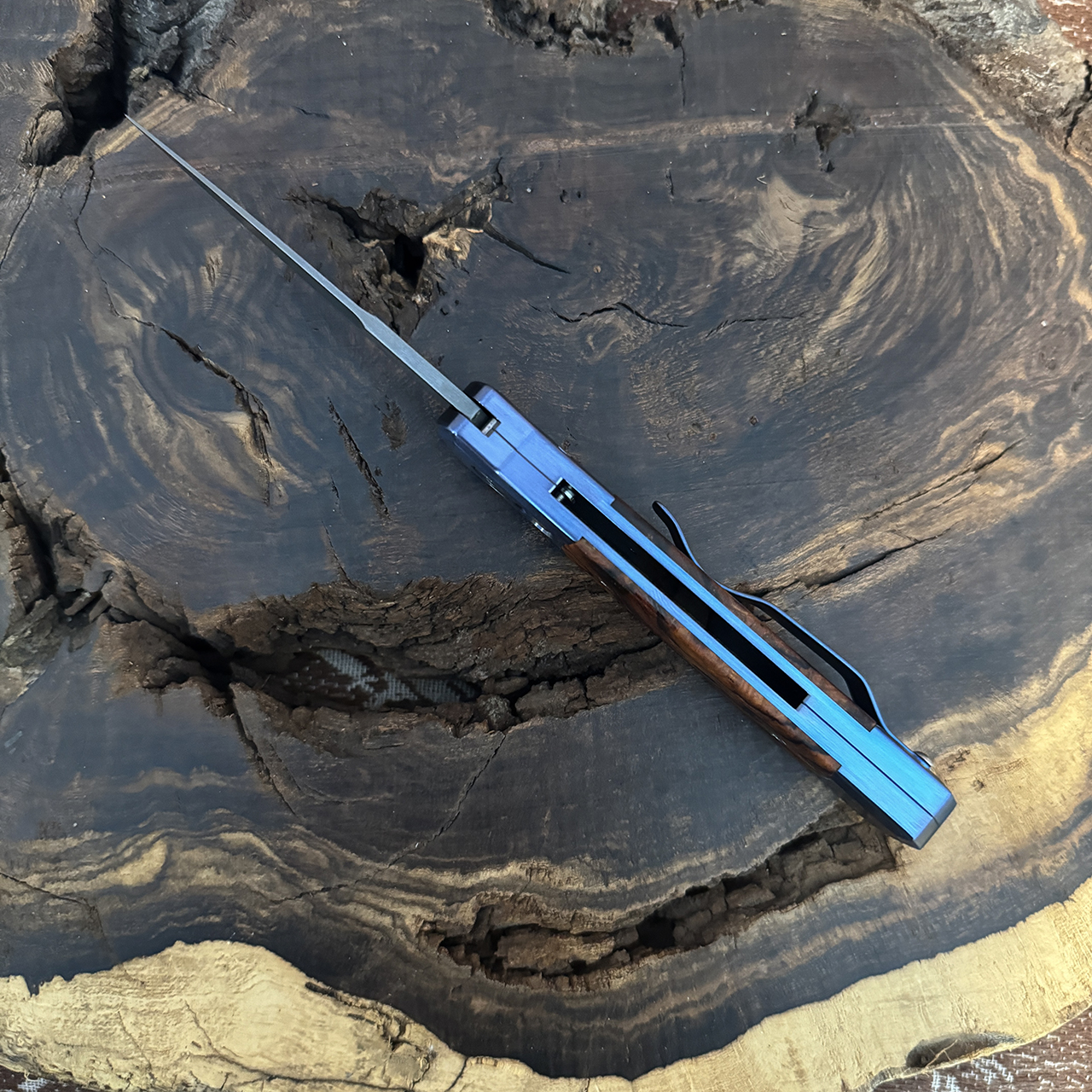 This limited edition 2024 Custom model features an orange peel finished blue anodized titainum handle with desert ironwood inlays. Chad Nichols damascus bayonet style spear point blade. Satin finished hardware. Mosaic pin inlaid push button. Matching blue anodized titanium pocket clip. Brand new in box.