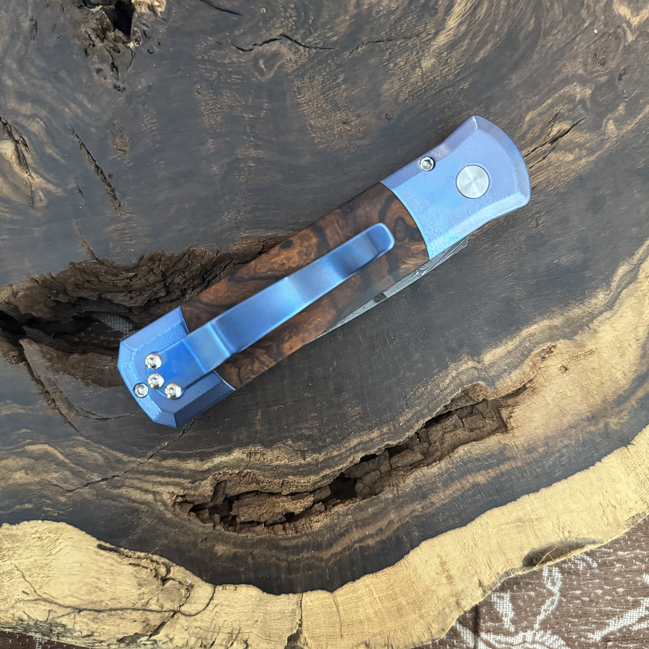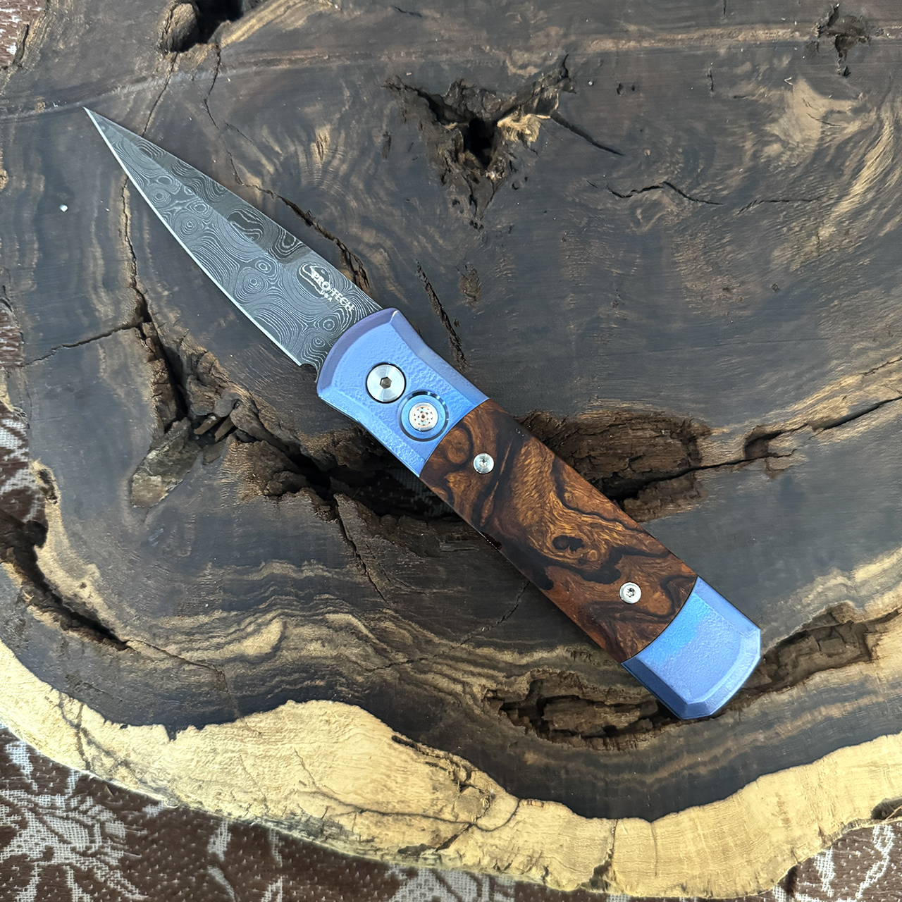 Pro-Tech Godson 2024 Custom 001 Orange Peel Blue Titanium Handle w/ Desert Ironwood Inlays Chad Nichols Damascus Blade Mosaic Button