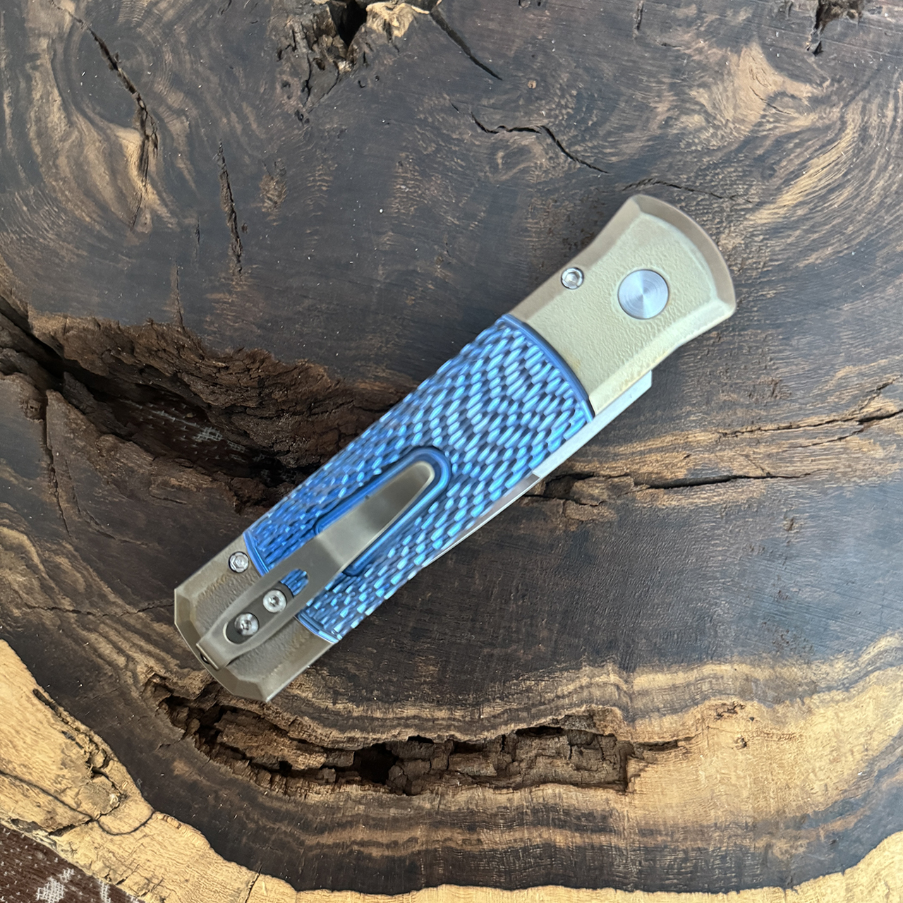 Pro-Tech Godson 2024 Custom 003 Titanium Handle w/ Blue Textured Center Bronze Bolsters Satin Blade