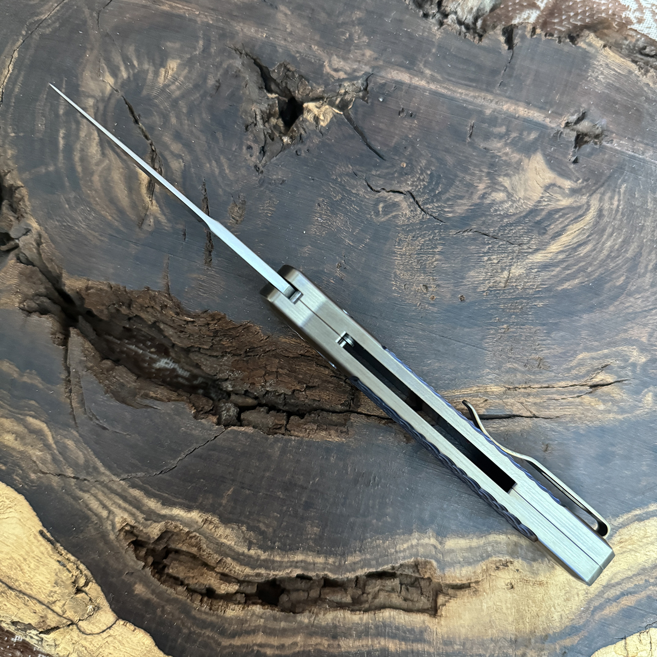 This limited edition 2024 Custom model features an 6al4v titainum handle with textured blue center. Satin finished bayonet style spear point blade. Bronze Bolsters. Satin finished hardware. Gold Pearl inlaid push button. Matching bronze anodized titanium pocket clip. Brand new in box.