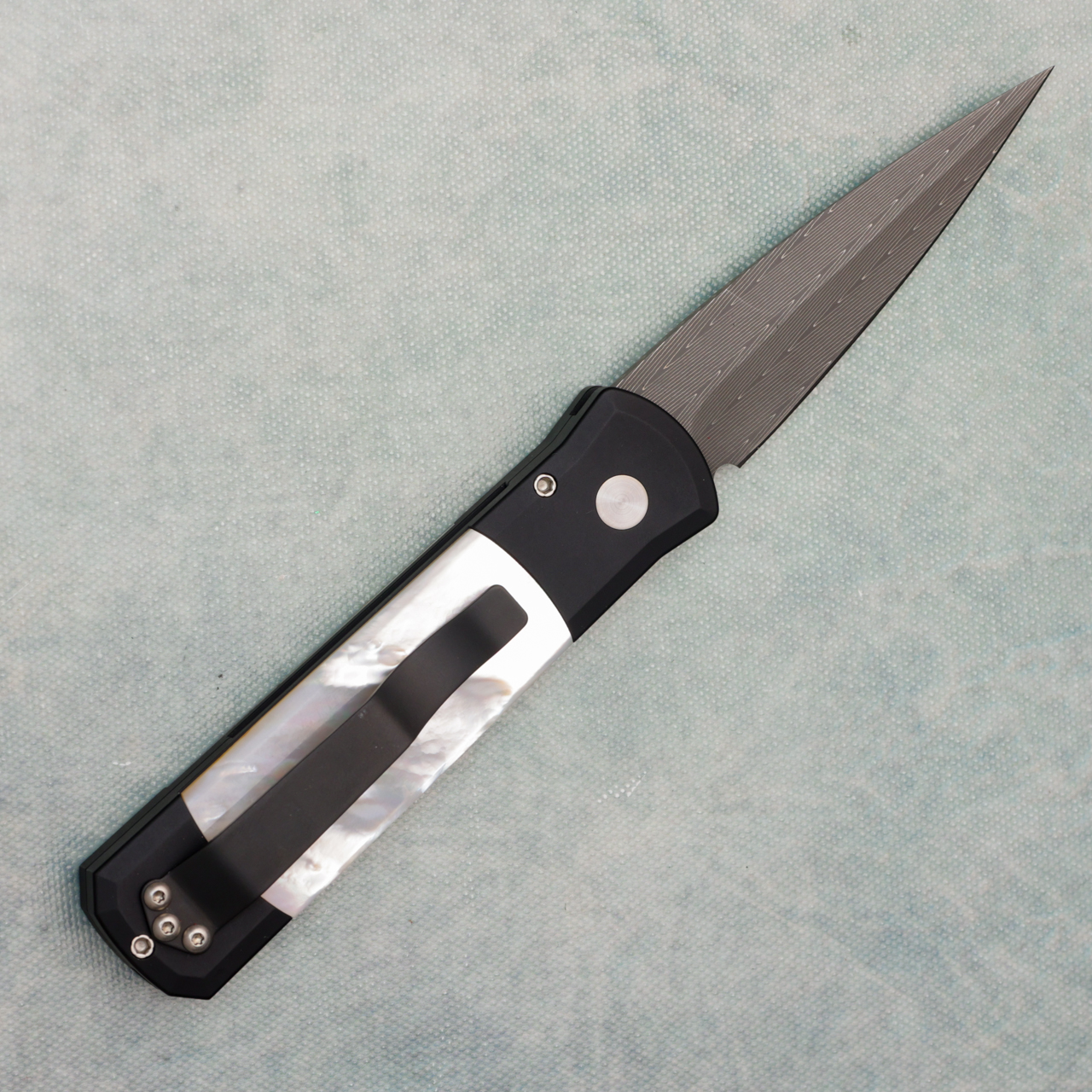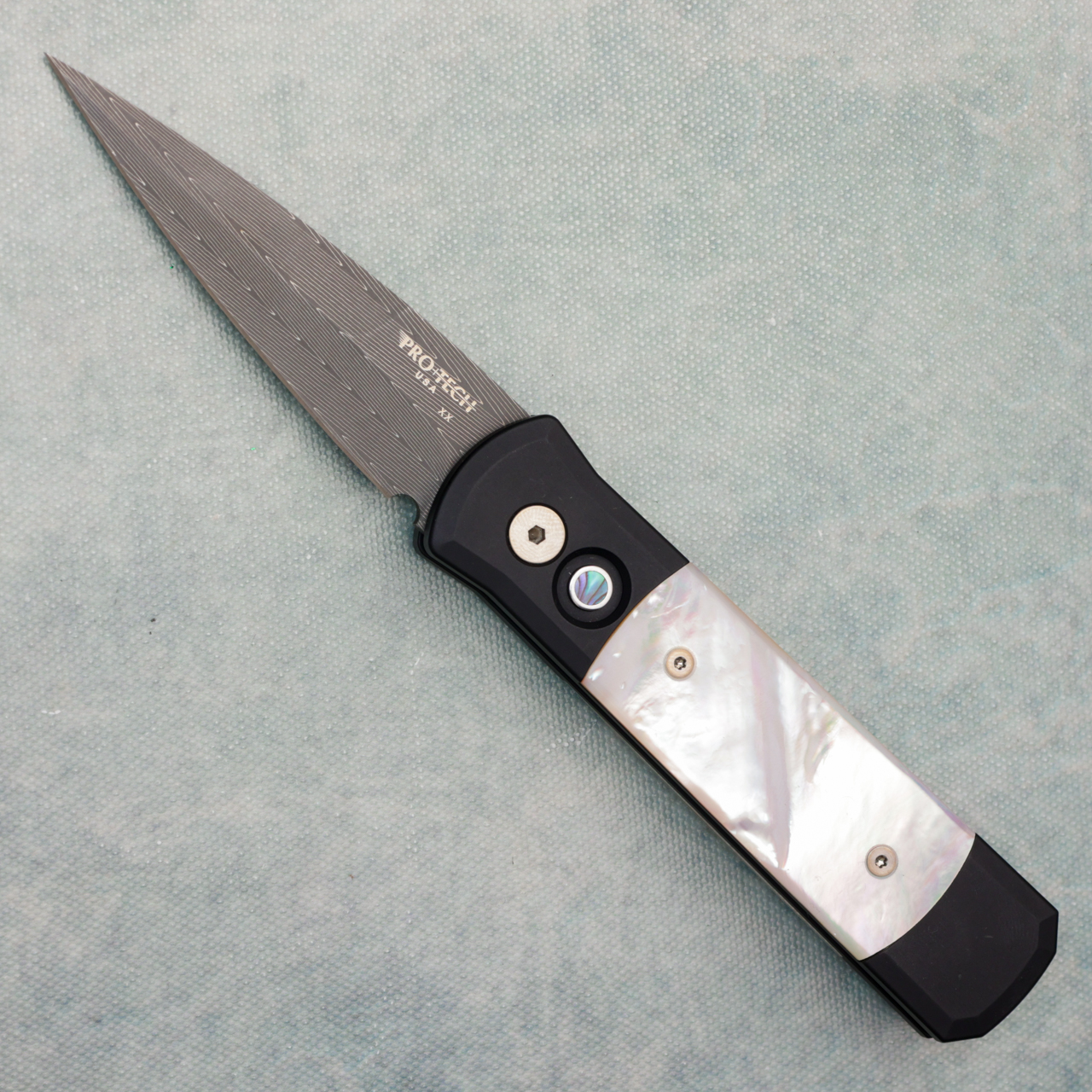 Pro-Tech Godson Black Aluminum Handle w/ Pearl Inlays Damascus Blade Abalone Button (Blem)