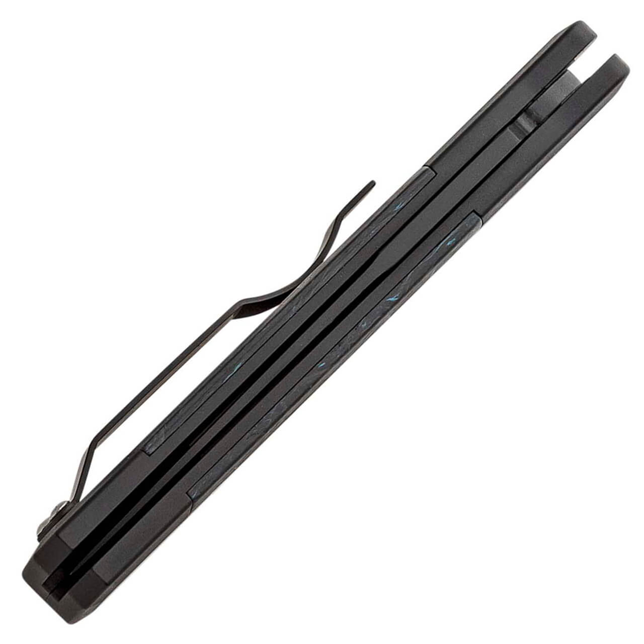 This features ablack anodized aluminum frame with blue Dark Matter Fat Carbon inlays on both sides. Black DLC finished 154-CM stainless steel bayonet style spear point blade. Satin finished hardware and black DLC finished pocket clip for tip up carry. Brand new in box.