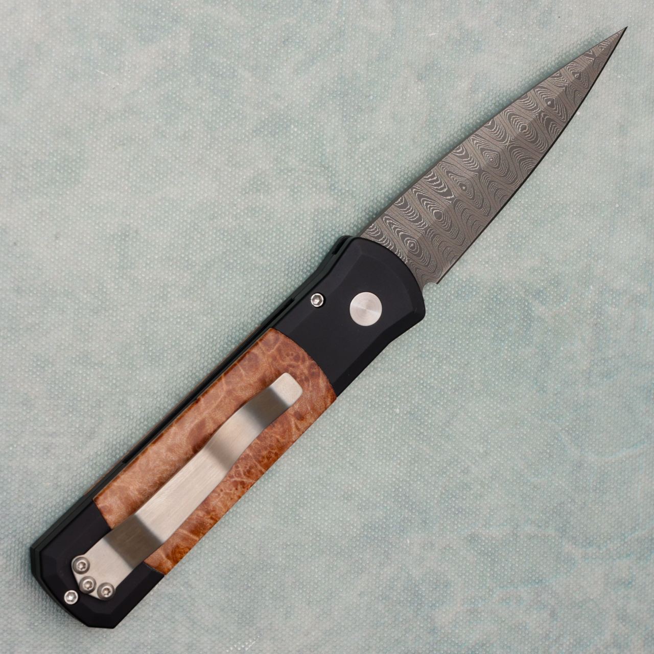 Pro-Tech Godson Black Handle w/ Maple Burl Wood Inlays Chad Nichols Damascus Blade Mosaic Button 706-DM (Consignment)