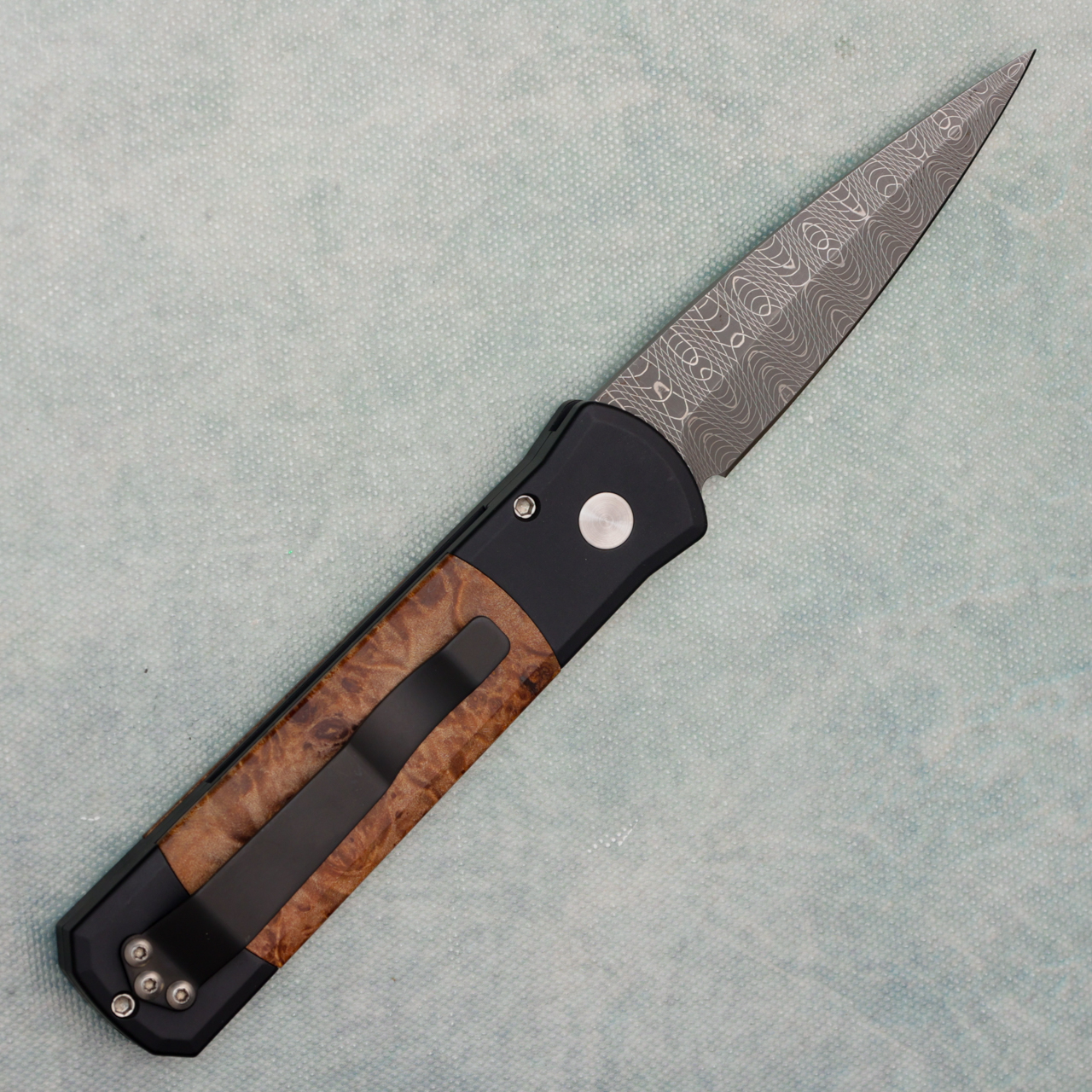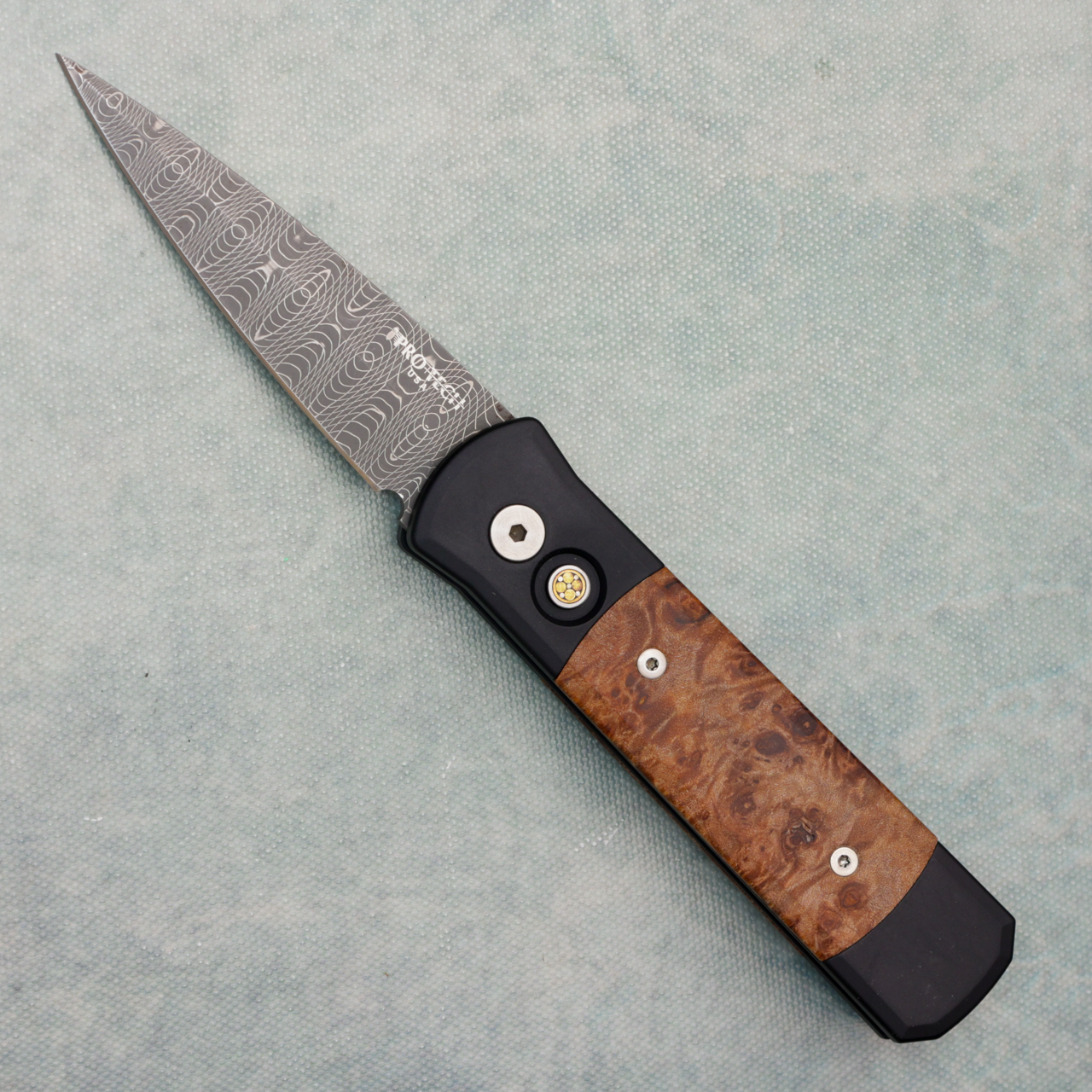 Pro-Tech Godson Black Handle w/ Maple Burl Wood Inlays Damascus Blade Mosaic Button Limited Edition 706-DAM (Pre-owned)