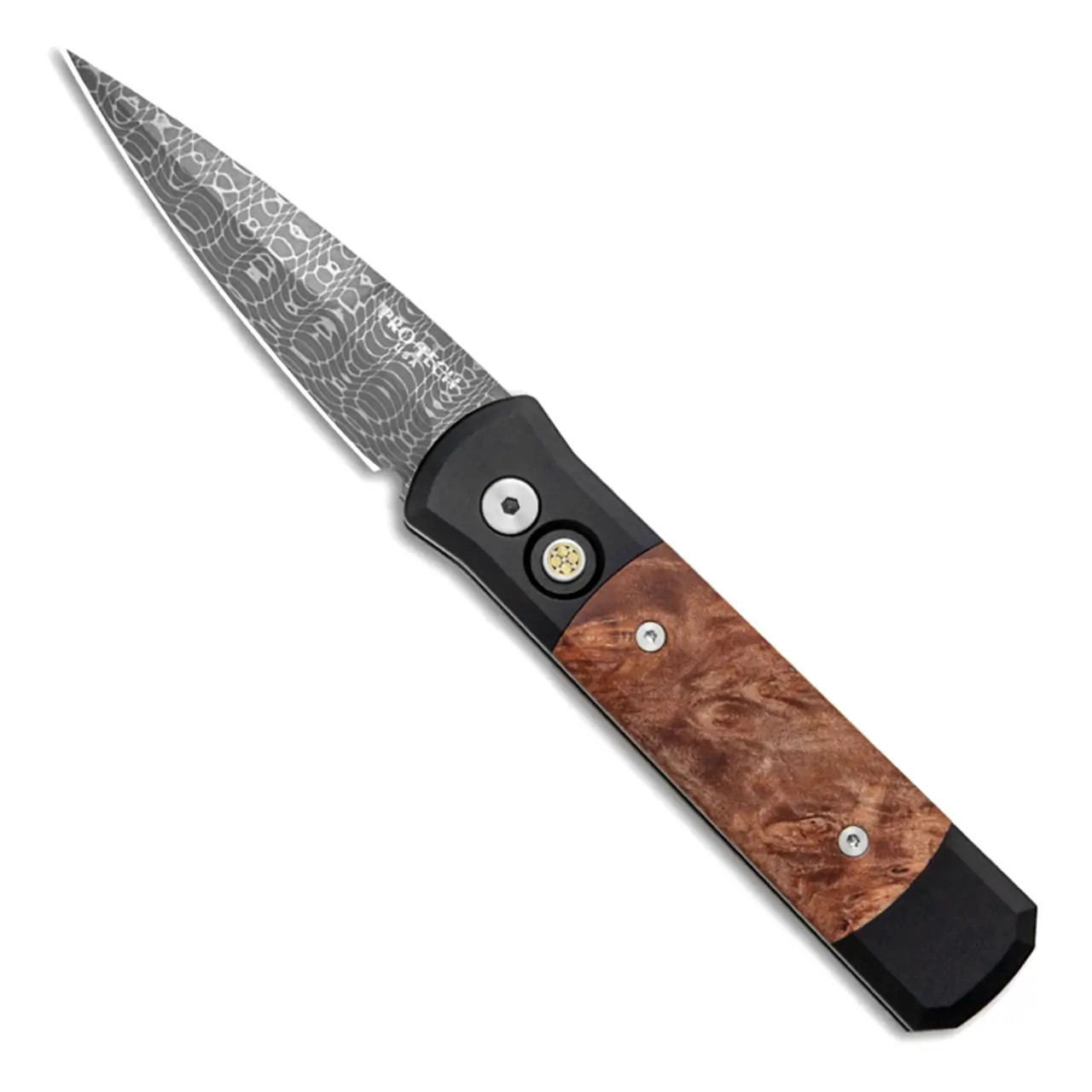 Pro-Tech Godson Black Handle w/ Maple Burl Wood Inlays Damascus Blade Mosaic Button Limited Edition 706-DAM