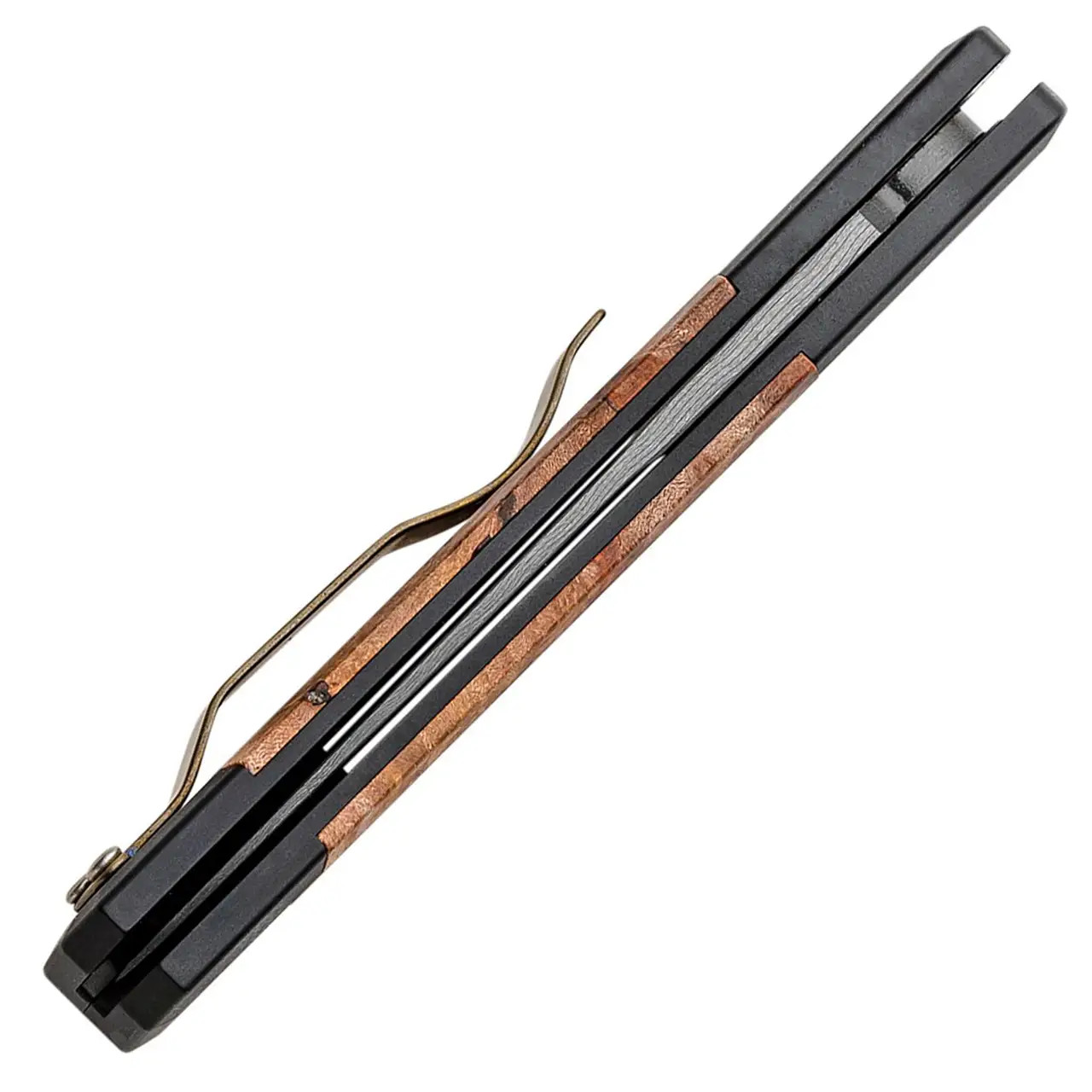 This limited edition model features black anodized aluminum handle scales with maple burl wood inlays on both sides. Chad Nichols "Ladder" pattern Damascus bayonet style spear point blade. Satin finished hardware. Bronze satin finished titanium pocket clip for tip up carry. Mosaic pin inlaid push button. Brand new in box.