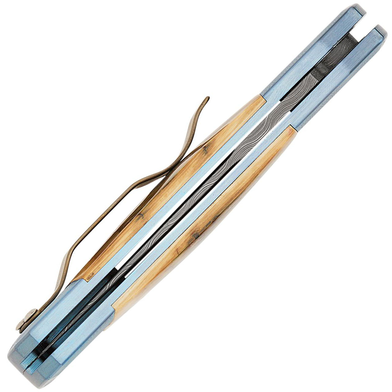 This limited edition Custom model features blue orange peel titanium handles with ancient bark mastodon inlays. Vegas Forge Spirograph damascus bayonet style spear point blade. Satin finished hardware. Mosaic push button. Satin titanium pocket clip. Brand new in box.