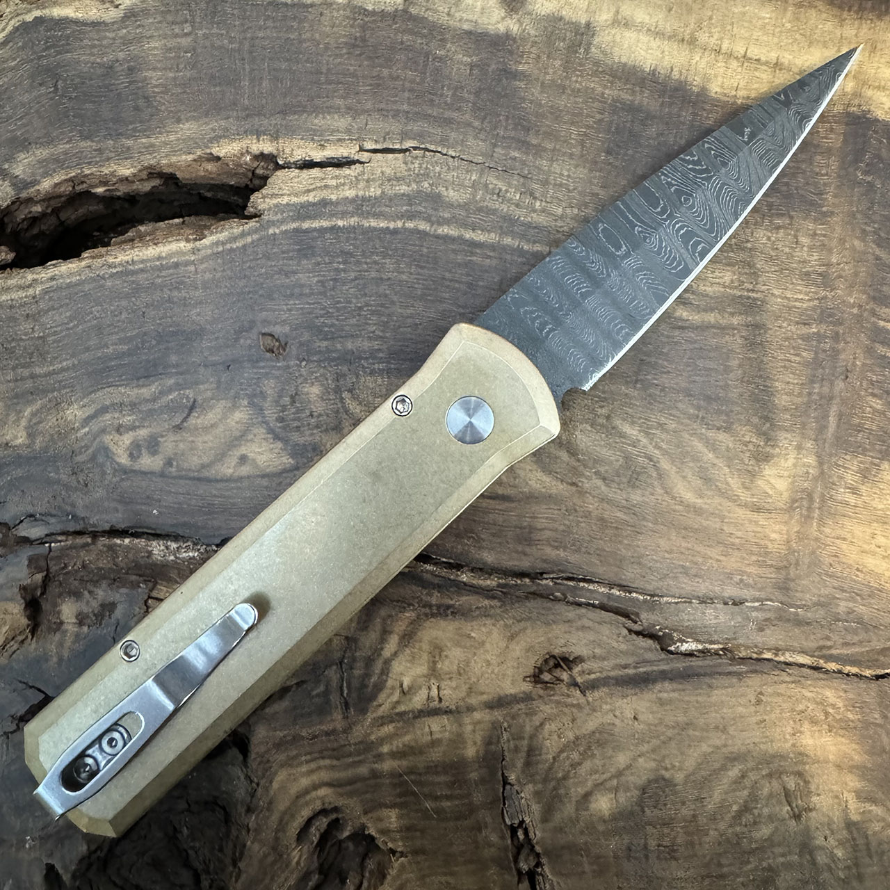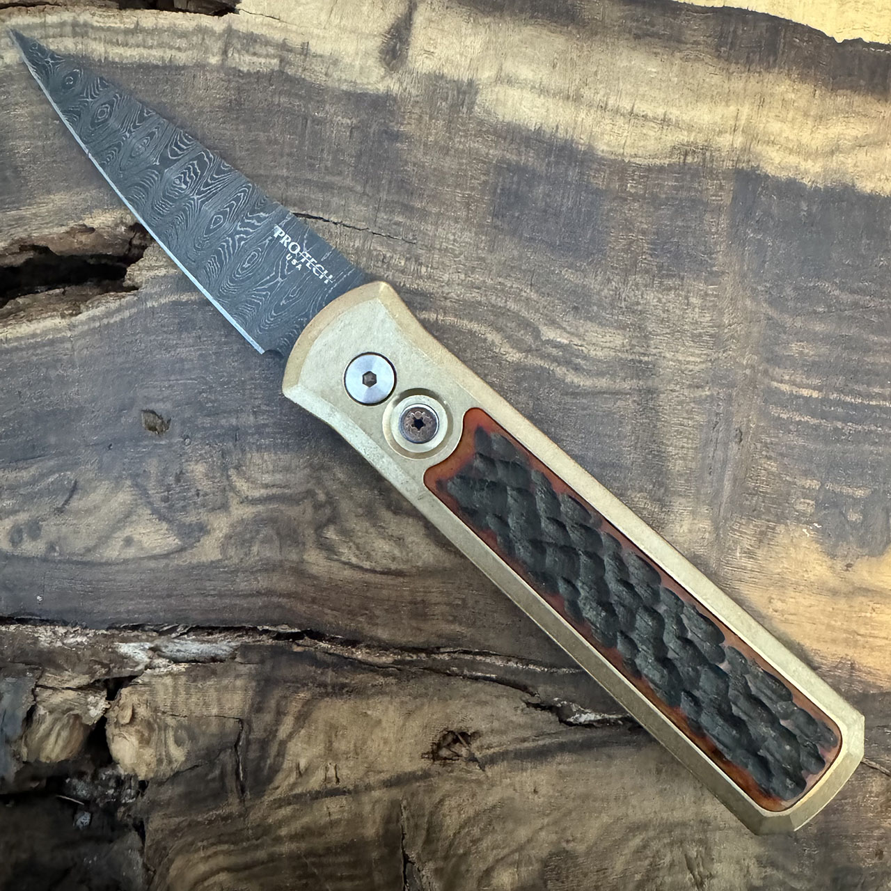 Pro-Tech Godson Custom Brass Handle w/ Jigged Bone Inlay Chad Nichols Damascus Blade Mosaic Button GS004