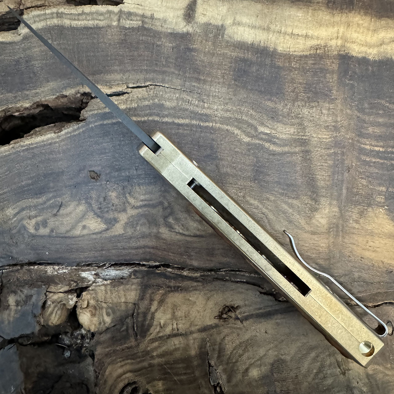This limited edition custom model features brass handles with a jigged bone inlay. Chad Nichols damascus bayonet style spear point blade. Satin finished hardware. Mosaic push button. Satin titanium pocket clip. Brand new in box.