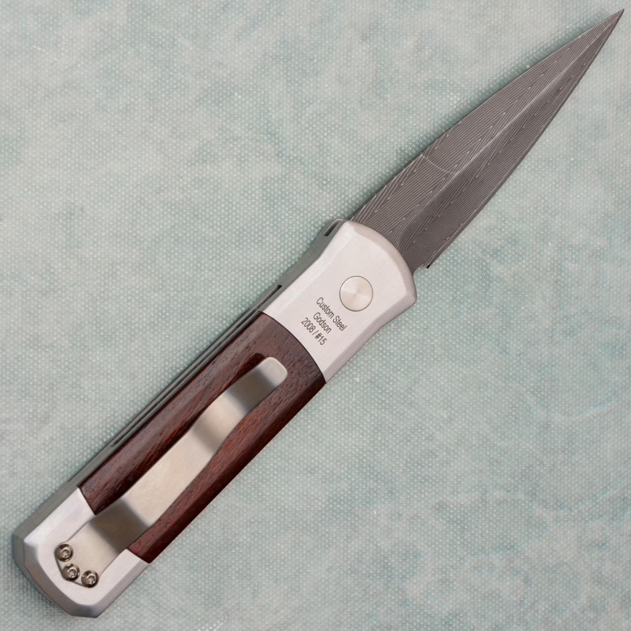 This custom model features steel handle scales with cocobolo wood inlays on both sides. Damascus bayonet style spear point blade. Satin finished hardware. Satin finished titanium pocket clip for tip up carry. Mosaic pin inlaid push button. Marked Custom Steel Godson 2008/ #15 on back. Has some scratches, and blade looks to have been sharpened. Comes in a box.
