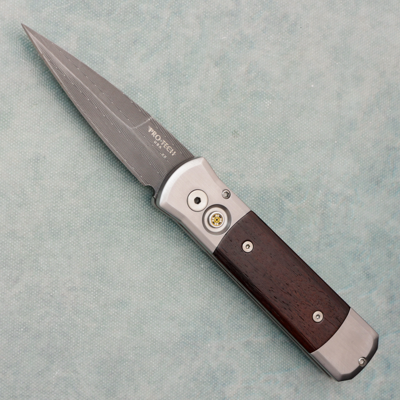 Pro-Tech Godson Custom Steel Handle w/ Cocobolo Wood Inlays Damascus Blade Mosaic Button (Consignment)