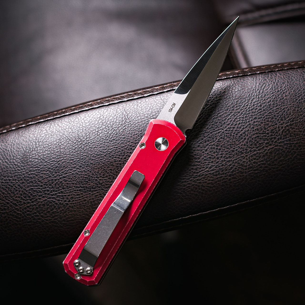 This model features a solid battleworn red anodized 6061-T6 aluminum handle. Satin finished 154-CM stainless steel blade. Satin finished hardware. Satin finished pocket clip. Pearl button. Brand new in box.