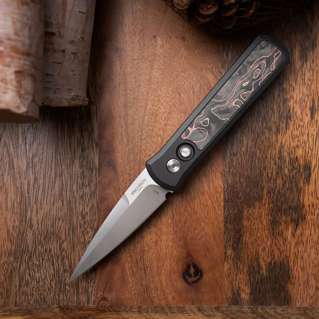 This model features a black anodized 6061-T6 aluminum handle with Protech Composites Livewire copper carbon fiber inlay. Satin finished CPM-20CV stainless steel blade. Satin finished hardware. Satin finished pocket clip. Pearl button. Brand new in box.