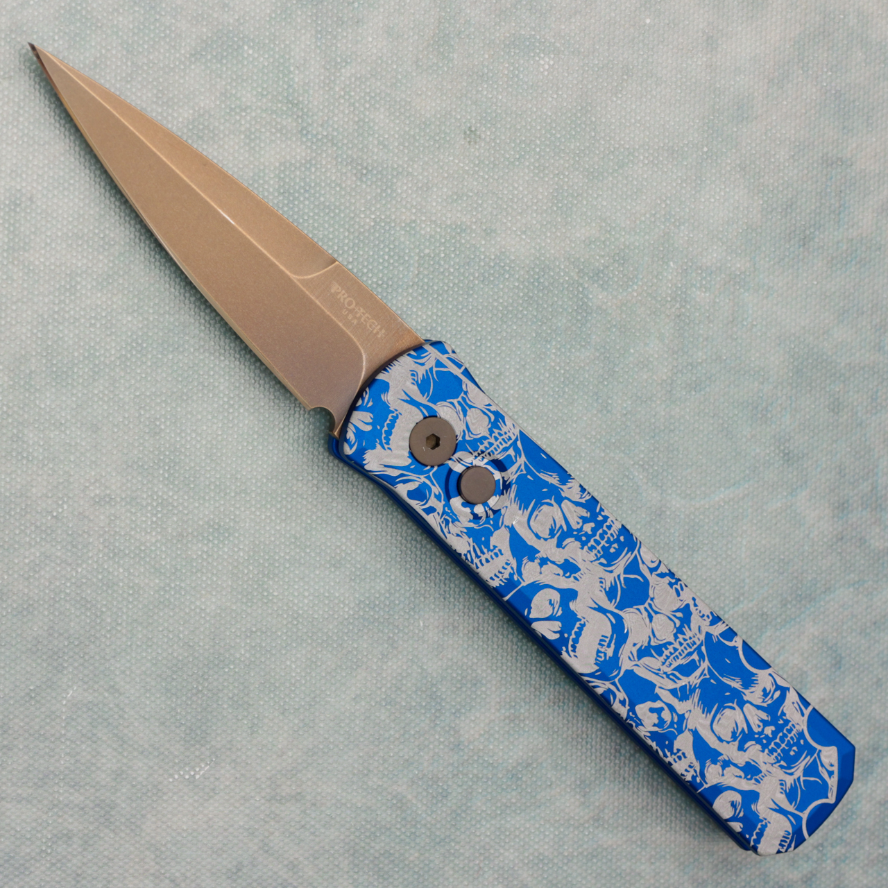 Pro-Tech Godson Solid Blue Skull Pattern Engraved Handle Bronzed Blade 720-BLUE AE CUSTOM SHOP