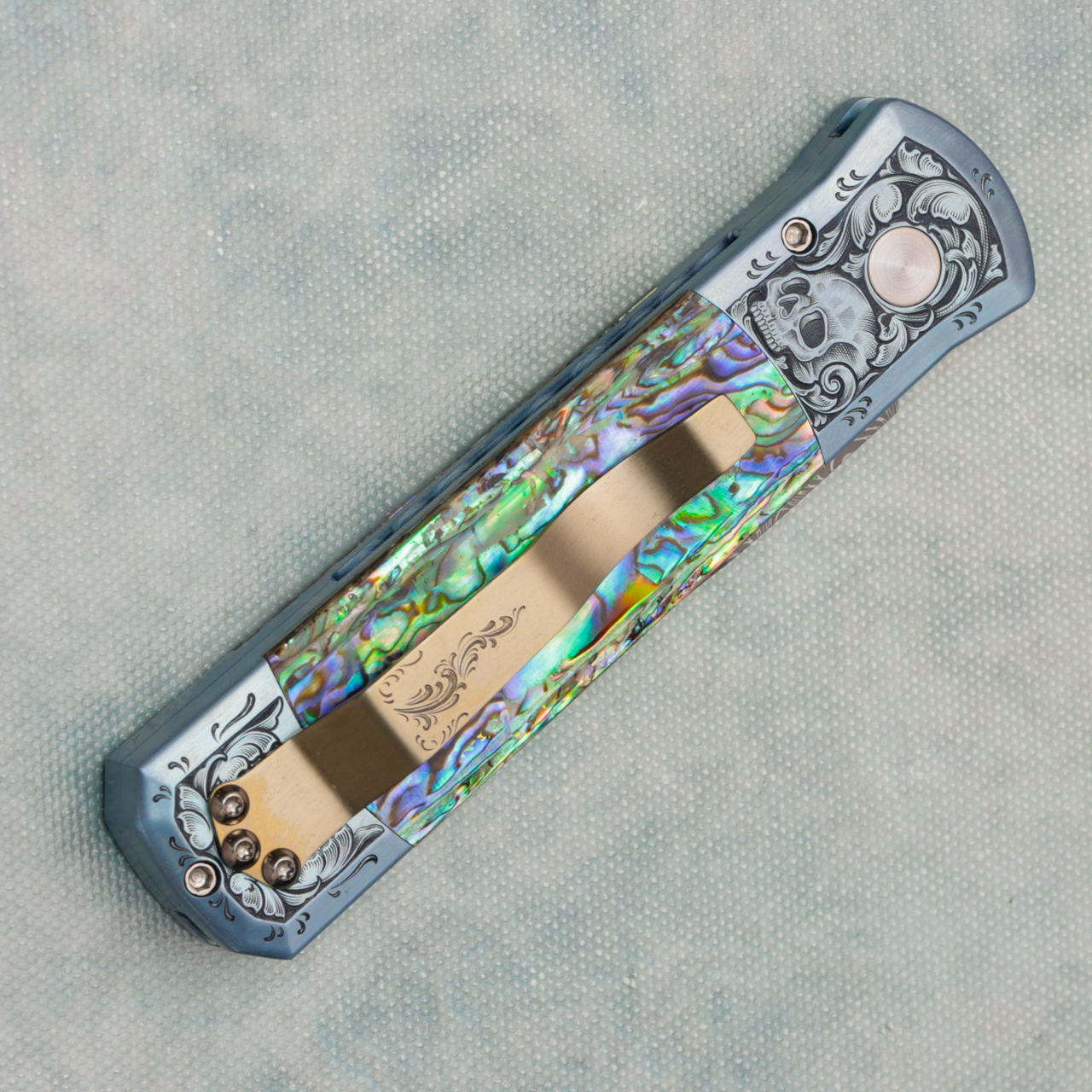 Pro-Tech Godson Titanium Ultimate Custom Tyler W. Prince Custom Engraved Light Blue Titanium Handles w/ Mosaic Abalone Inlays Vegas Forge Damascus Blade Abalone Button