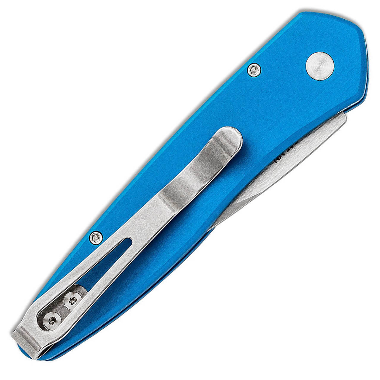 This model has solid blue anodized 6061-T6 aluminum handle scales. Stonewash finished CPM-S35VN stainless steel spear point blade. Satin finished hardware and a polished tip up deep carry pocket clip. Brand new in box.
