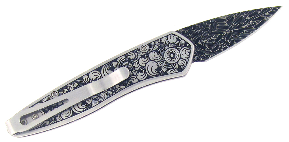 This incredible custom creation features a solid 416 stainless steel frame with hand satin finish and is custom hand engraved by Bruce Shaw. The hand is full coverage scroll theme engraved. Beautiful gold lip inlaid push button. Awesome Chad Nichols mosaic Damascus blade. This heirloom quality custom piece is engraved by master engraver Bruce Shaw with incredible attention to detail. Old world craftsmanship and precision knife making have come together in a spring steel delight! These knives truly are the best of the best! Born October of 2013. Comes in a beautiful engraved cherry wood velvet lined display box.