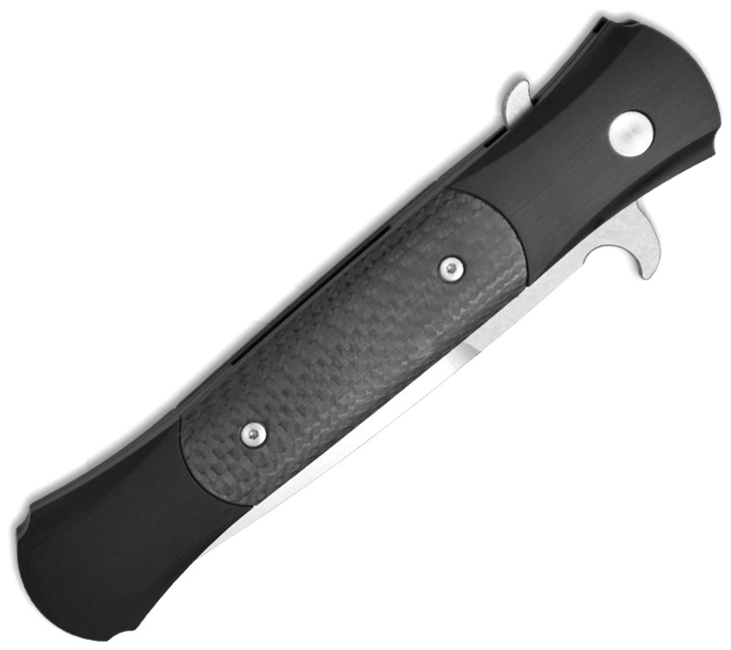 This model, the 1904, features black anodized aluminum frame with carbon fiber inlays for the modern look. Satin finished 154-CM stainless steel blade. All satin finished hardware. Brand new in black display box.