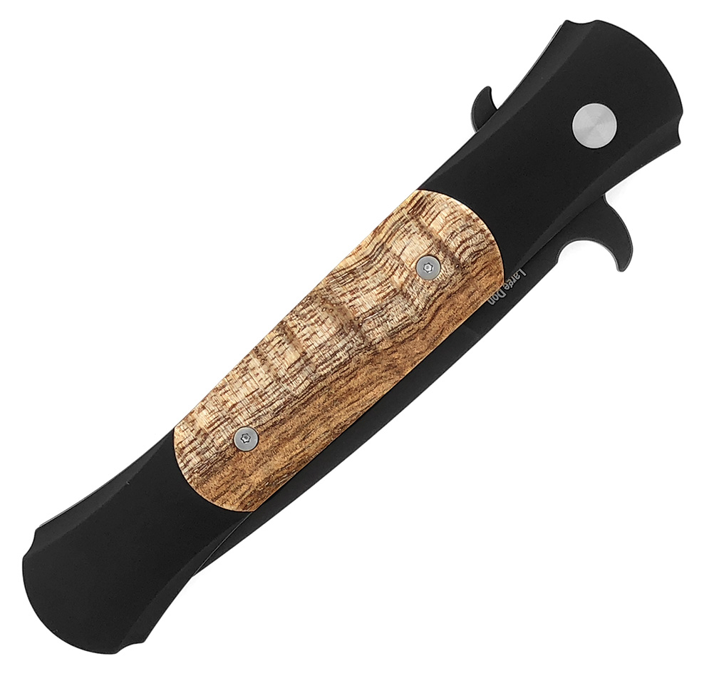 This limited edition model features fully 3D machined curved surface black anodized 6061-T6 aluminum frame with beautiful Koa wood inlays. Black finished 154-CM stainless steel blade. Satin finished hardware. Mosaic pin inlaid push button. Brand new in black display box.