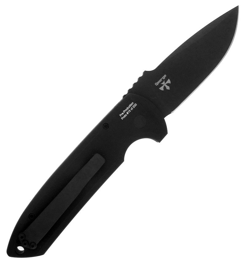 Designed by military expert Les George and put into production by Pro-Tech. This knife is superb with the quality we have all come to expect from Pro-Tech. Black anodized 6061-T6 aluminum handle scales with knurling for better grip. Black DLC coated CPM-D2 tool steel blade, the front bears the Pro-Tech logo and the back has the Les George cross. Black tip up carry pocket clip and lanyard hole. New in box.