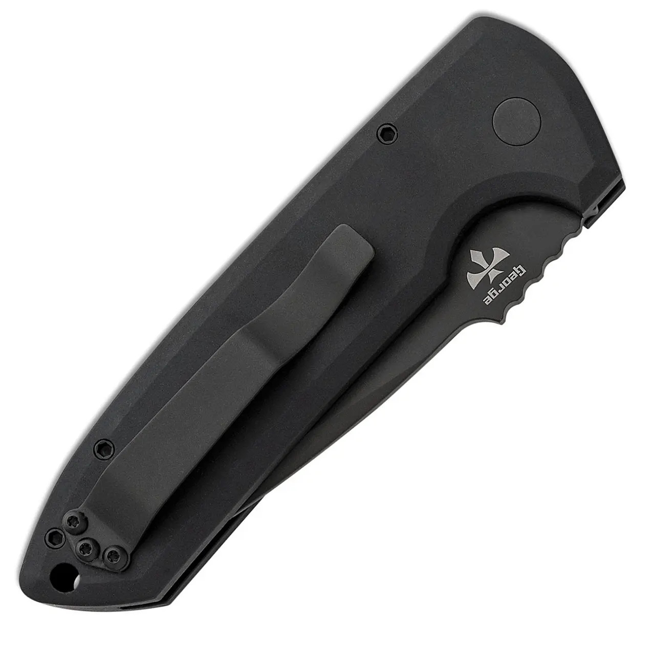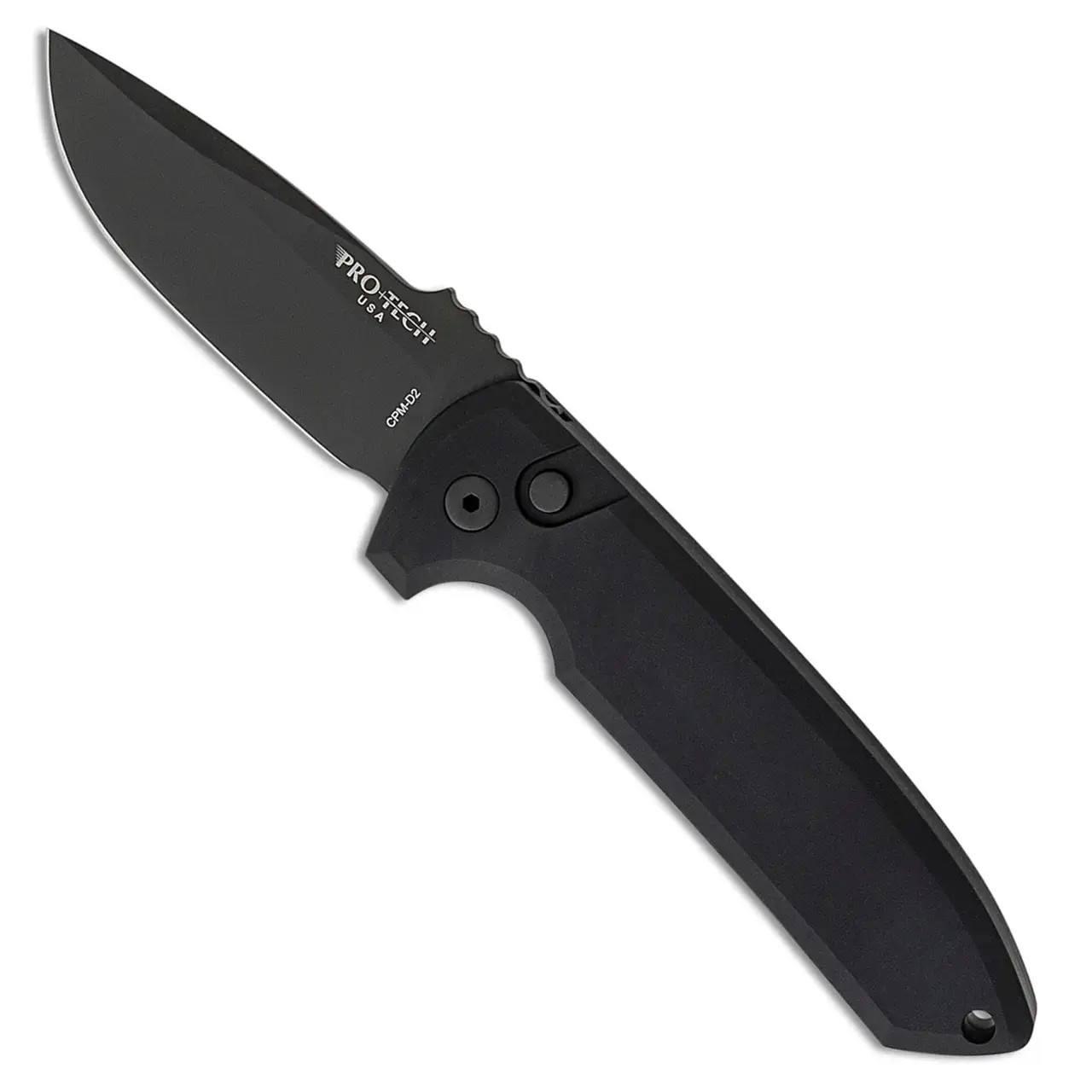 This model features a solid black anodized aluminum handle. Black DLC finished CPM-D2 tool steel drop point blade. Black DLC finished hardware and pocket clip. The blade is marked with the ProTech logo, Les George logo and model information. Brand new in box.