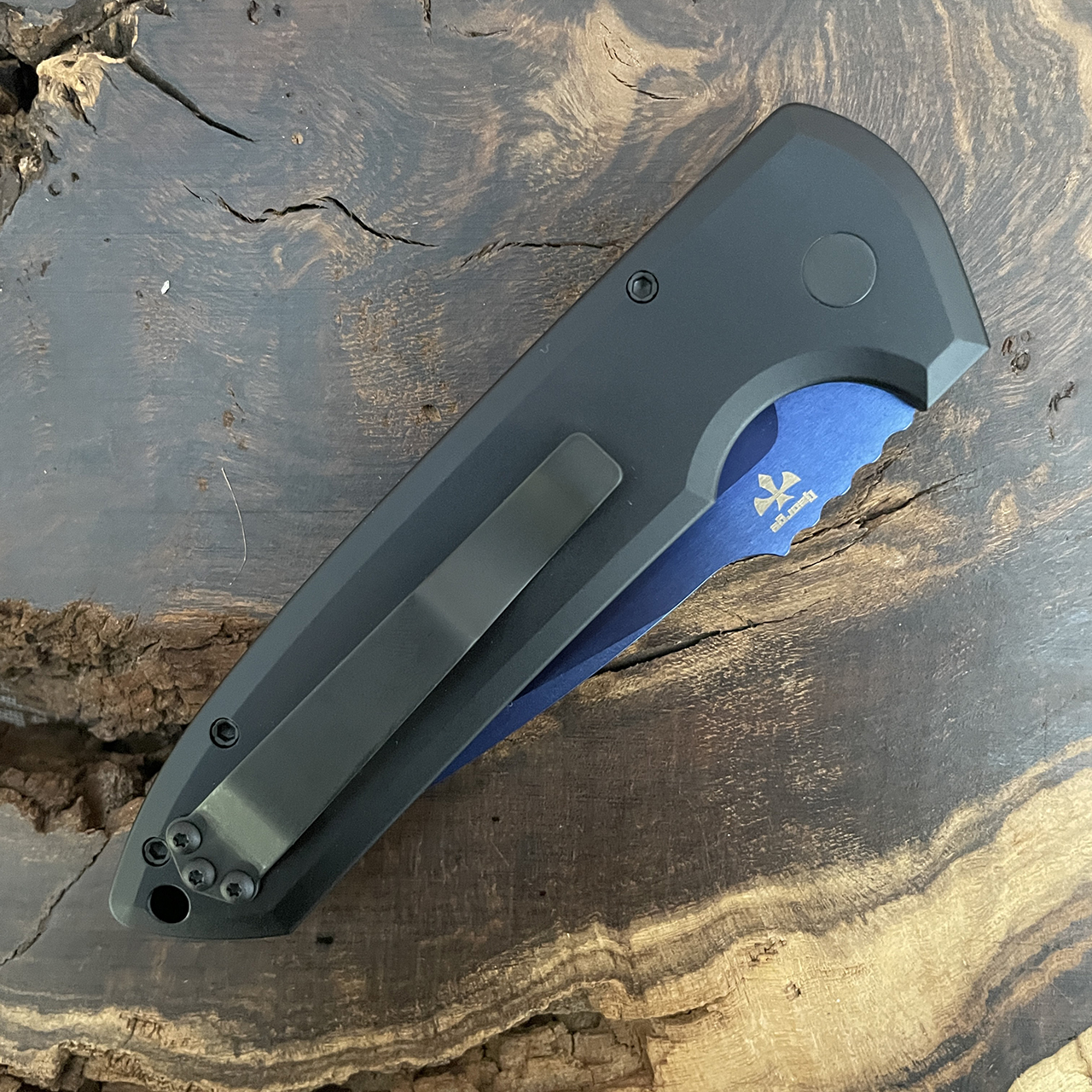 This model features a textured black anodized aluminum handle. Sapphire Blue finished S35-VN drop point blade. Pearl Push button. Brand new in box.