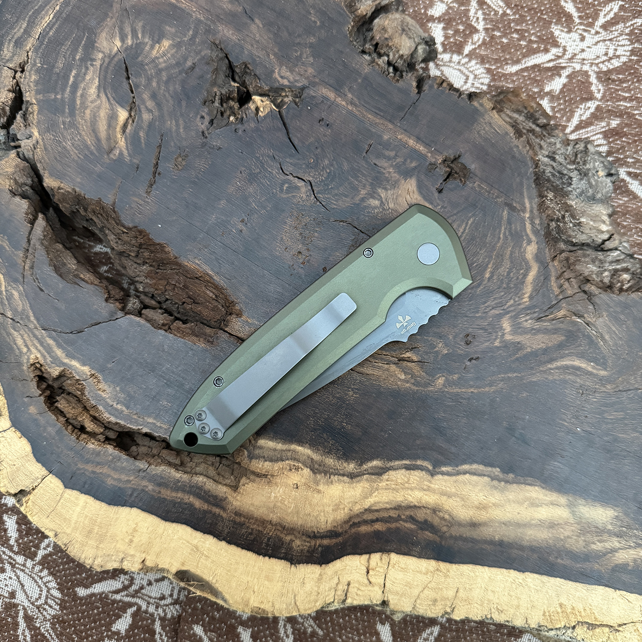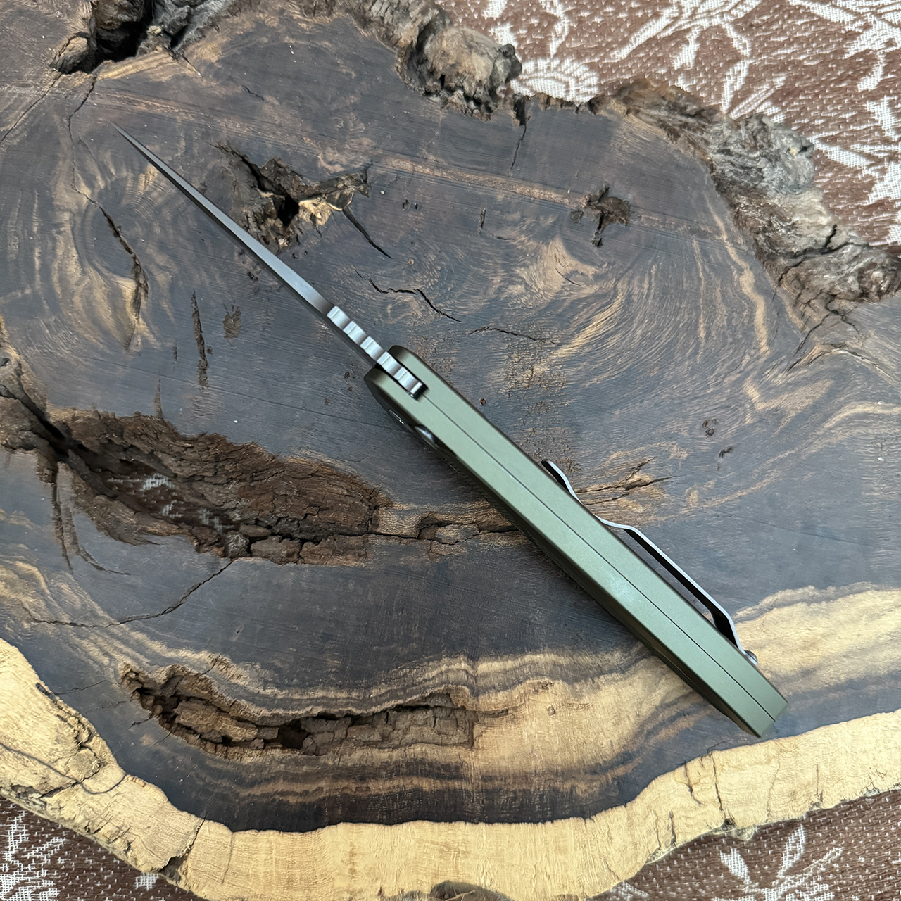 This model features a textured green anodized aluminum handle. Smoky Grey DLC finished CPM-D2 stainless steel drop point blade. Bead Blast finished hardware and pocket clip. Brand new in box.
