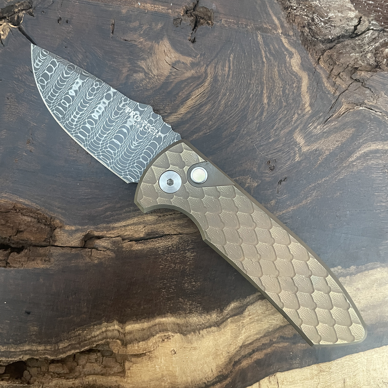 Pro-Tech Les George SBR Custom Blue Bronze Anodized Double Feather Textured Titanium Vegas Forge Spirograph Damascus Blade 2023-SBR-005