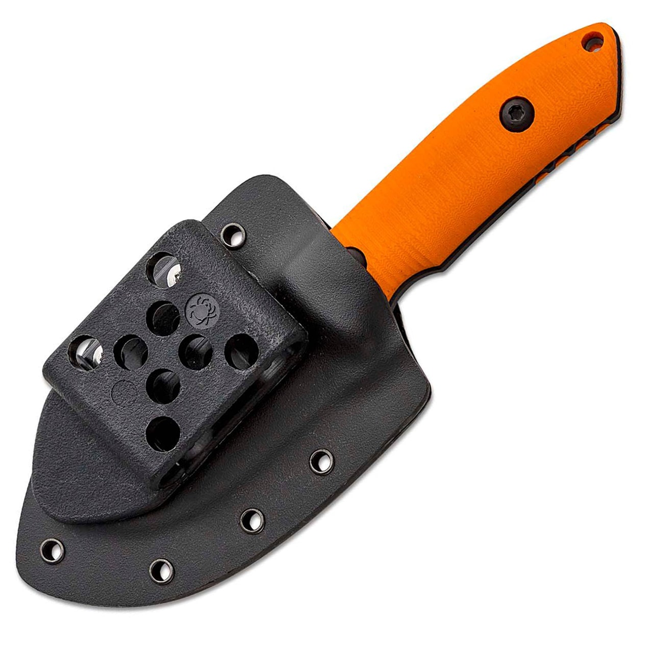 This model features textured orange G-10 handle scales. Black DLC finished CPM-S35VN stainless steel drop point blade. The blade is marked with the Pro-Tech logo, the Les George logo, and the model information. Black DLC finished hardware. Black kydex sheath with G-Clip. Brand new in box.