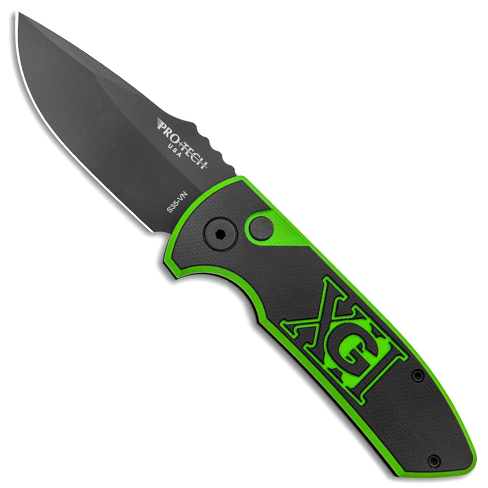 This limited edition model features a black and green layered G-10 top scale with the USN GXII logo and a black anodized 6061-T6 aluminum bottom handle scale. Black DLC finished CPM-S35VN stainless steel drop point blade. Black DLC finished hardware and pocket clip. The blade is marked with the Pro-Tech logo, the Les George logo, and the model information. The serial number is etched on the edge of the frame #XX of 100 made for USN The Gathering 2021. Brand new in box.
