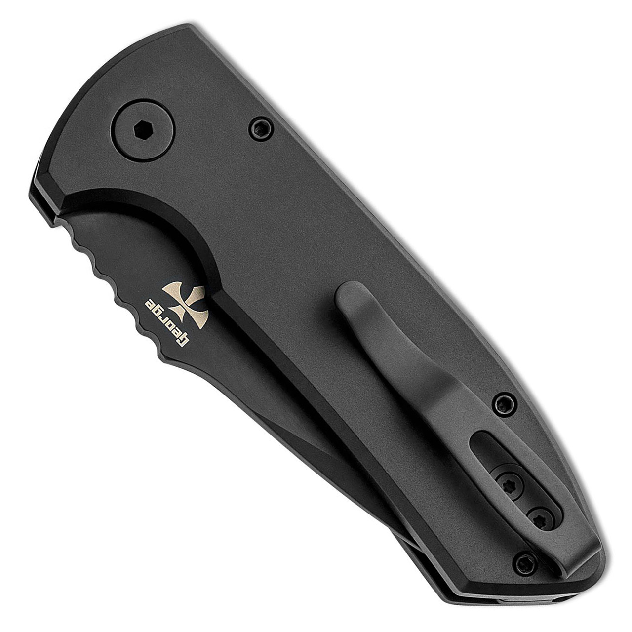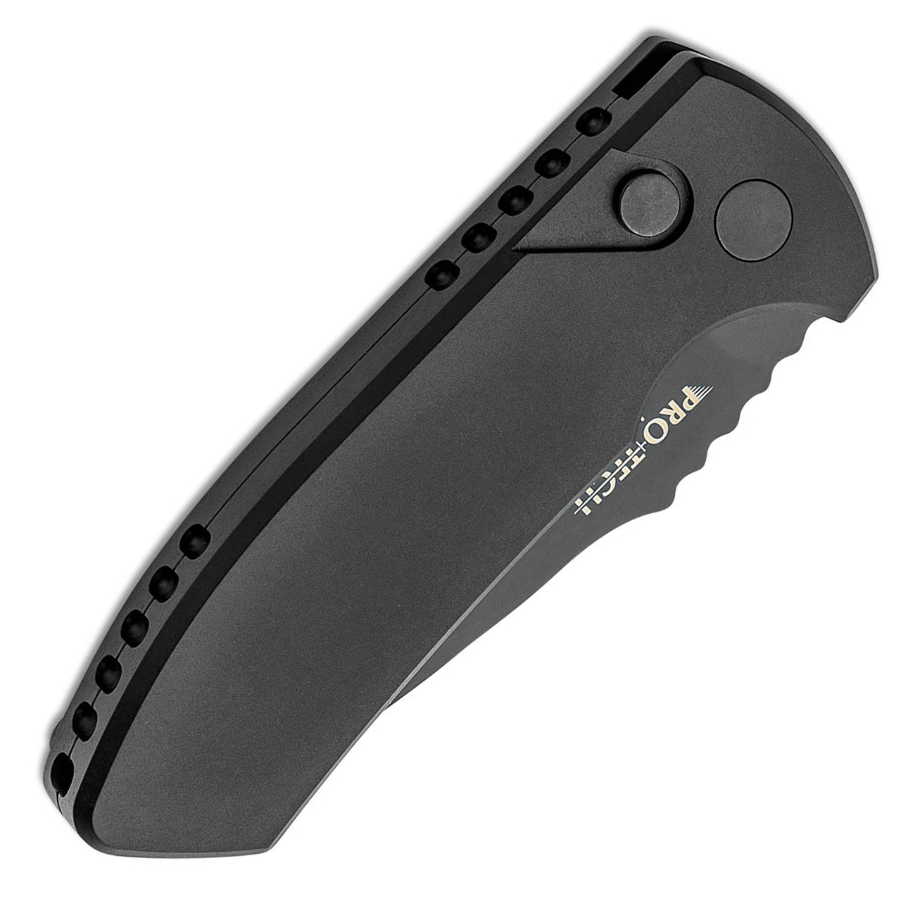 This lefty model is set up for dedicated left handed operation and features solid black anodized 6061-T6 aluminum handle scales. Black DLC finished CPM-S35VN stainless steel blade. The blade is marked with the Pro-Tech logo, the Les George logo, and the model information. Black DLC finished hardware and pocket clip. Brand new in box.