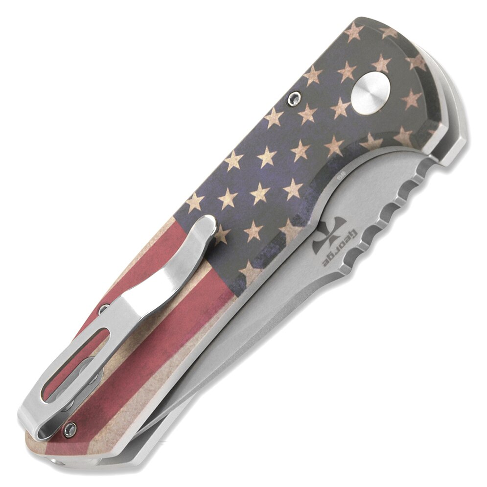 This model features custom Peter Kellett PK Vintage Flag anodized 6061-T6 aluminum handle scales. Stonewash finished CPM-S35VN stainless steel blade. The blade is marked with the Pro-Tech logo, the Les George logo, and the model information. Polished pocket clip. Satin finished hardware. Mother of pearl inlaid push button. The frame edge is etched with the serial number. Brand new in box.