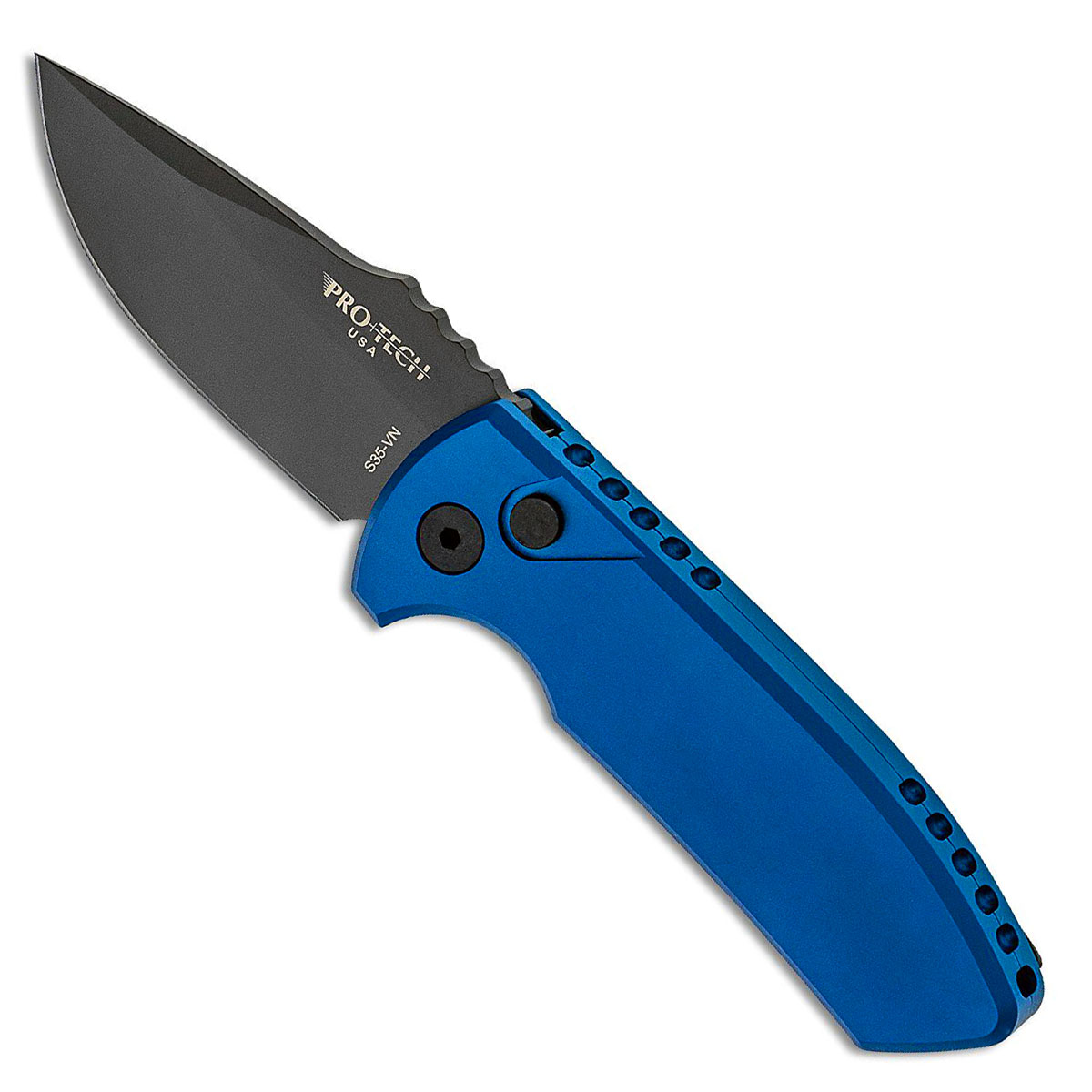 This model features blue anodized 6061-T6 aluminum handle scales. Black DLC finished CPM-S35VN stainless steel blade. The blade is marked with the Pro-Tech logo, the Les George logo, and the model information. Black DLC finished hardware and deep carry pocket clip. Brand new in box.