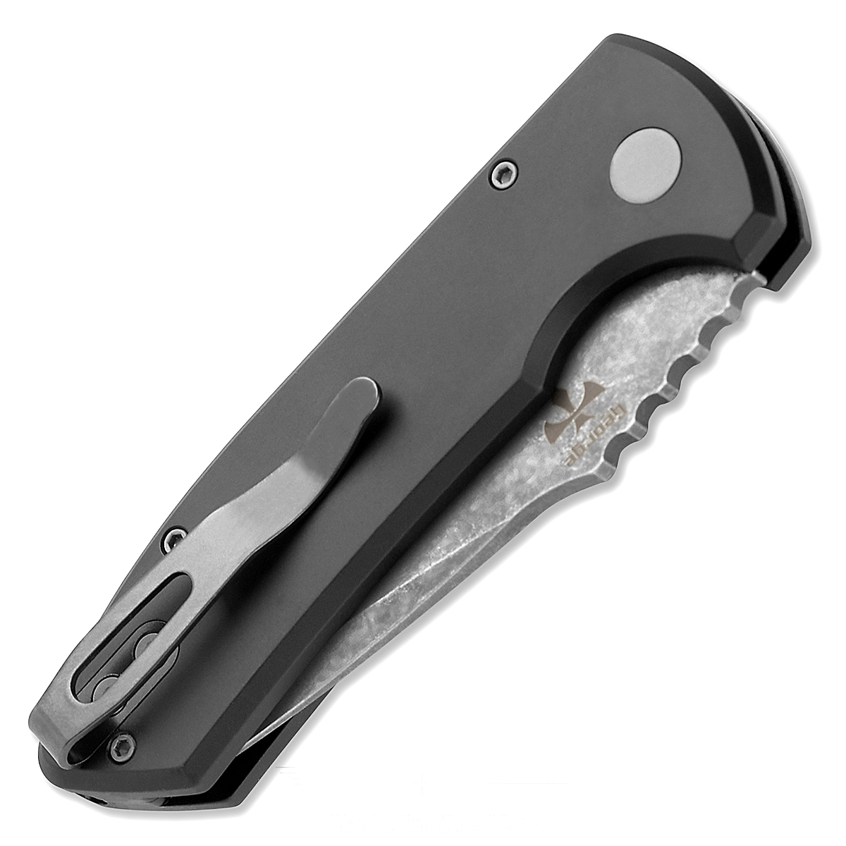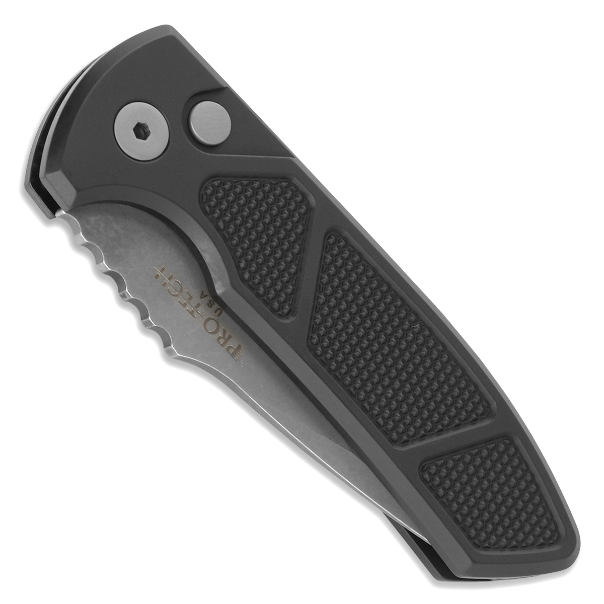This model features knurl textured black anodized 6061-T6 aluminum handle scales. Acid wash finished CPM-S35VN stainless steel blade. The blade is marked with the Pro-Tech logo, the Les George logo, and the model information. Black DLC finished pocket clip. Bead blast finished hardware. Brand new in box.