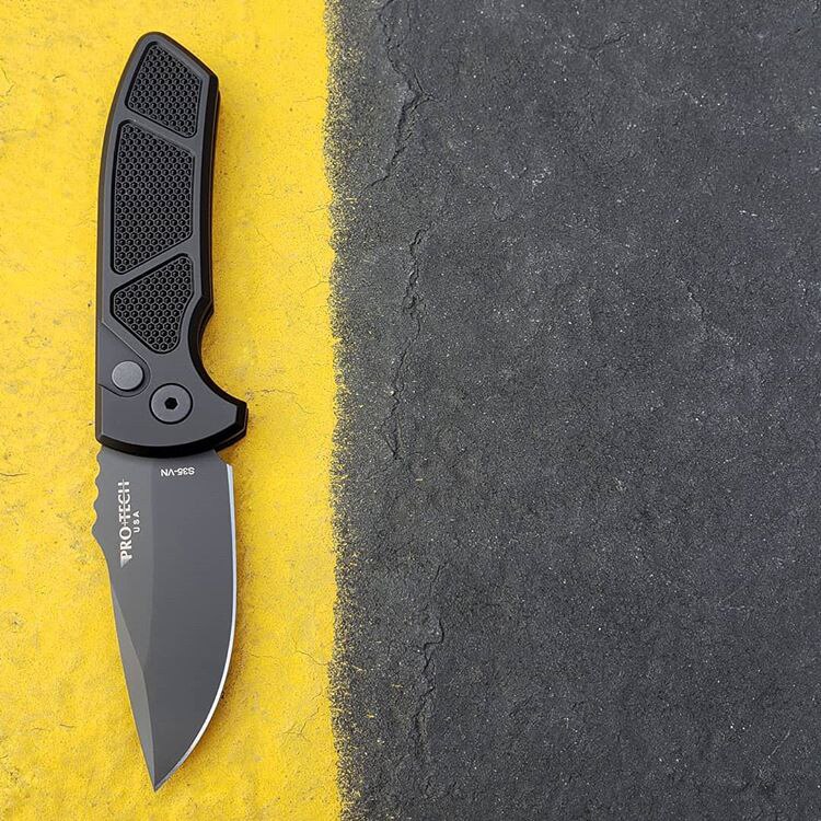 This model features knurl textured black anodized 6061-T6 aluminum handle scales. Black DLC finished CPM-S35VN stainless steel blade. The blade is marked with the Pro-Tech logo, the Les George logo, and the model information. Black DLC finished pocket clip and hardware. Brand new in box.