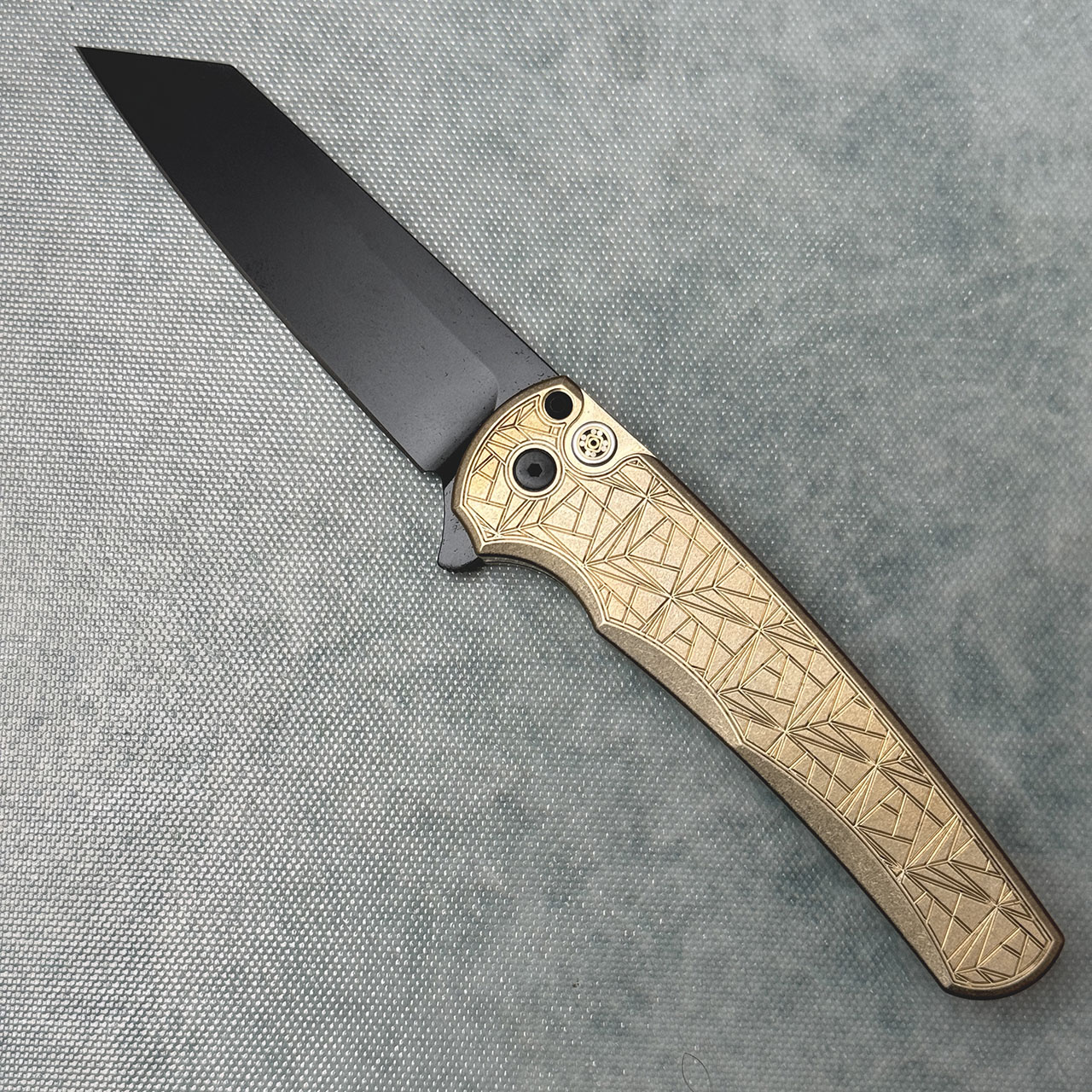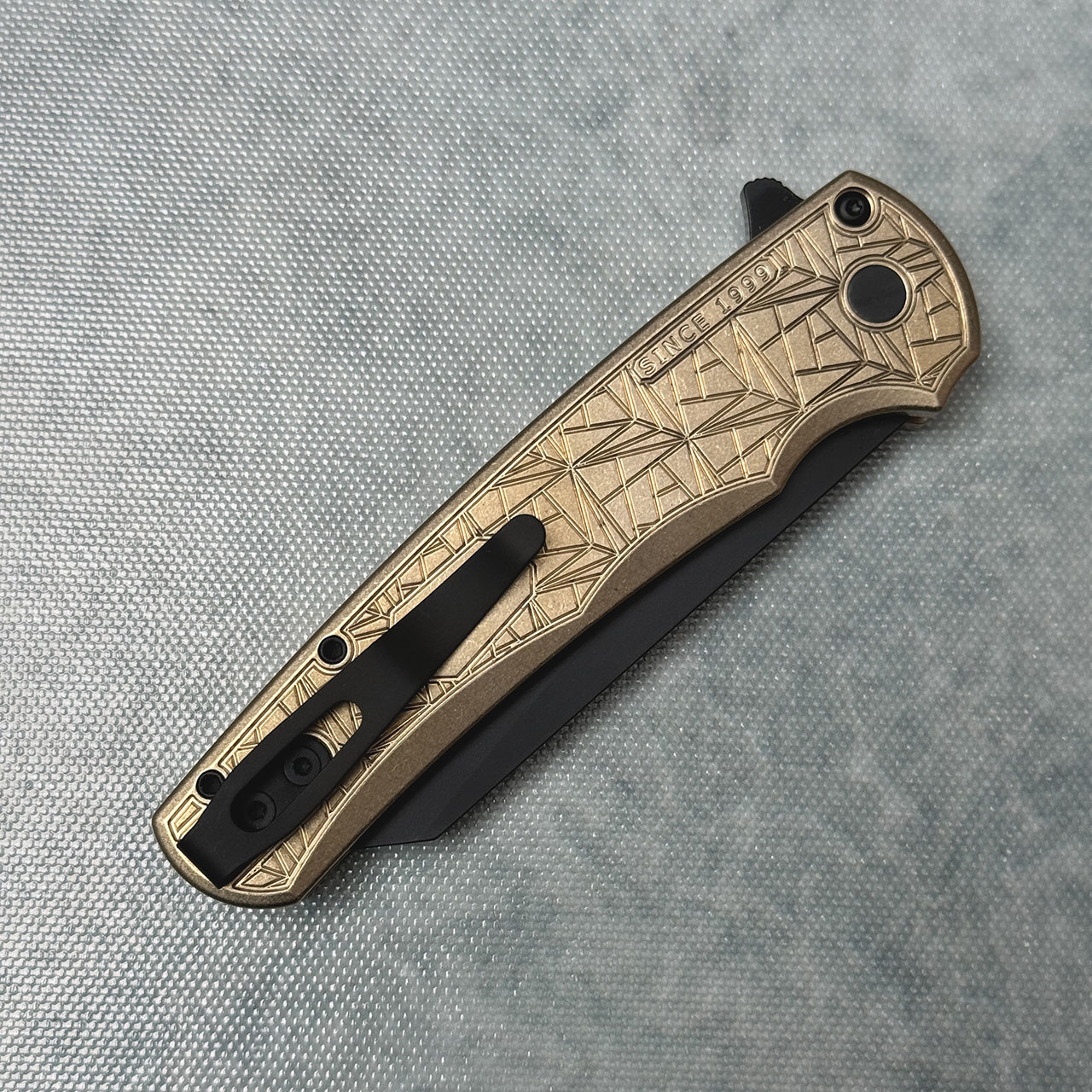 This model features Nexus since 1999 pattern AlBronze handle scales. DLC finished CPM-MagnaCut stainless steel reverse tanto blade. Mosaic button, DLC hardware and pocket clip for tip up carry. Brand new in box.