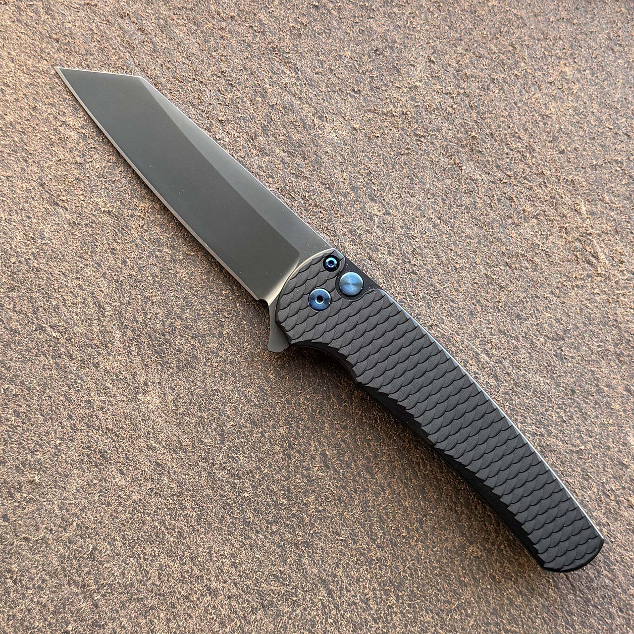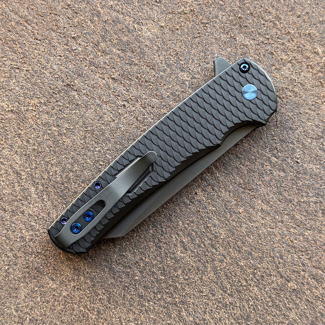 This model features dragon scale textured black 7075 aluminum handle scales. Smoky grey DLC finished CPM-MagnaCut stainless steel reverse tanto blade. Sapphire blue hardware and black pocket clip for tip up carry. Numbered xx of 125. Brand new in box.