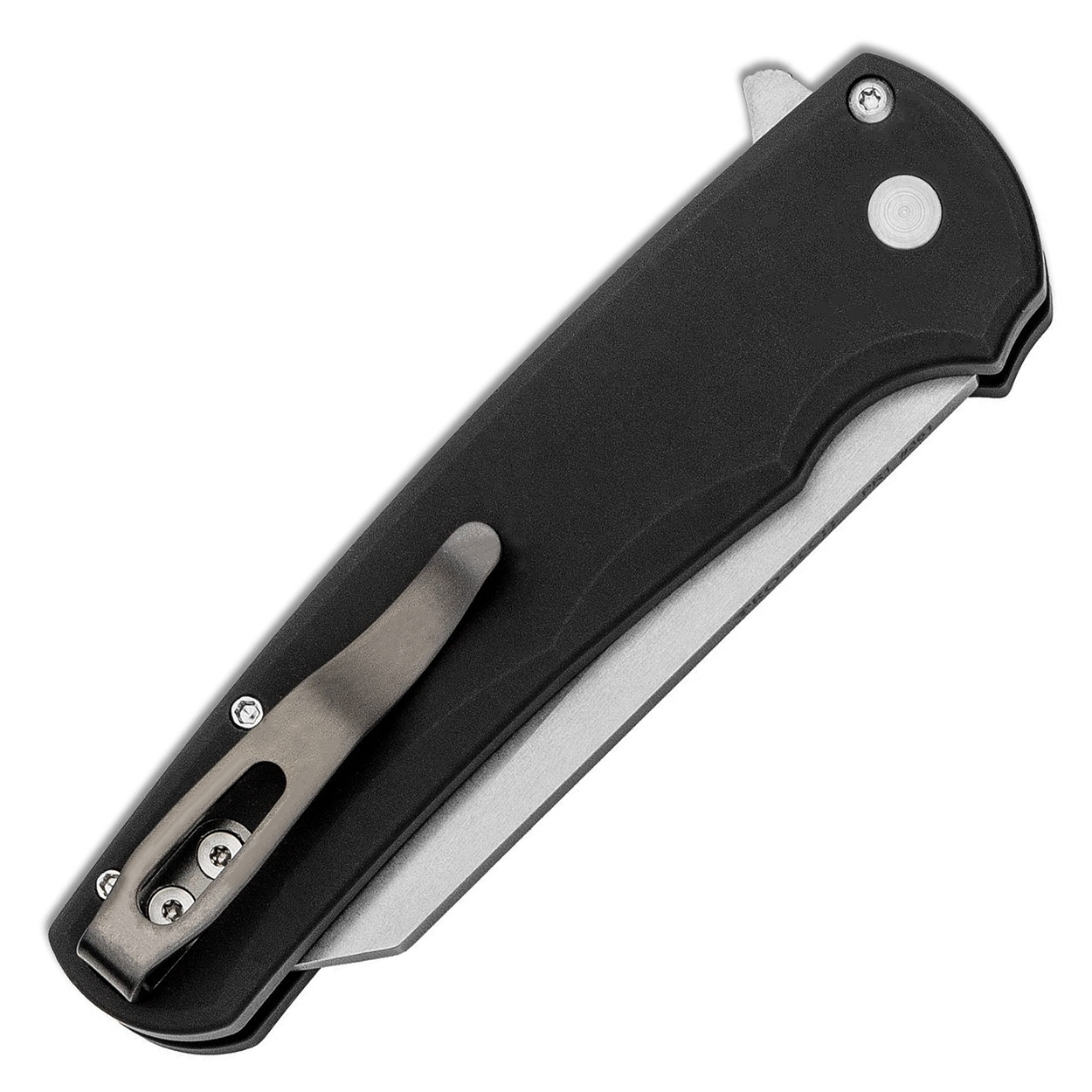 This model features solid black anodized 7075 aluminum handle scales. Stonewash finished CPM-20CV stainless steel reverse tanto blade. Satin finished hardware and black DLC finished pocket clip for tip up carry. Brand new in box.