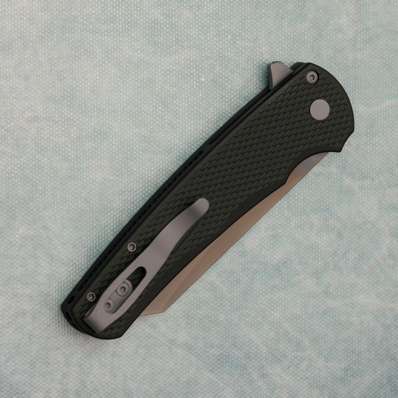 This model features textured green 7075 aluminum handle scales. Smoky grey DLC finished CPM-MagnaCut stainless steel reverse tanto blade. Bead blast hardware and pocket clip for tip up carry. Brand new in box.