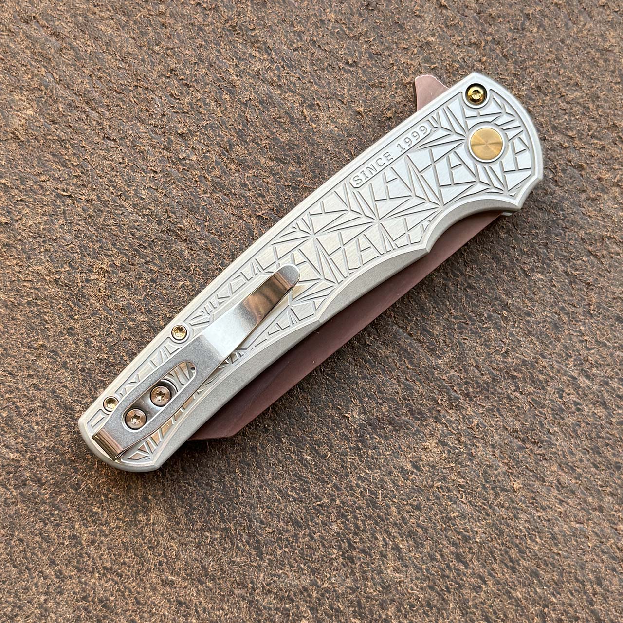 This model features nexus textured 2-tone satin/tumbled 17-4 steel handle scales. Copper rose pvd finished MagnaCut reverse tanto blade. Satin finished hardware and pocket clip for tip up carry. Black lip pearl button. Numbered xx of 40. Brand new in box.