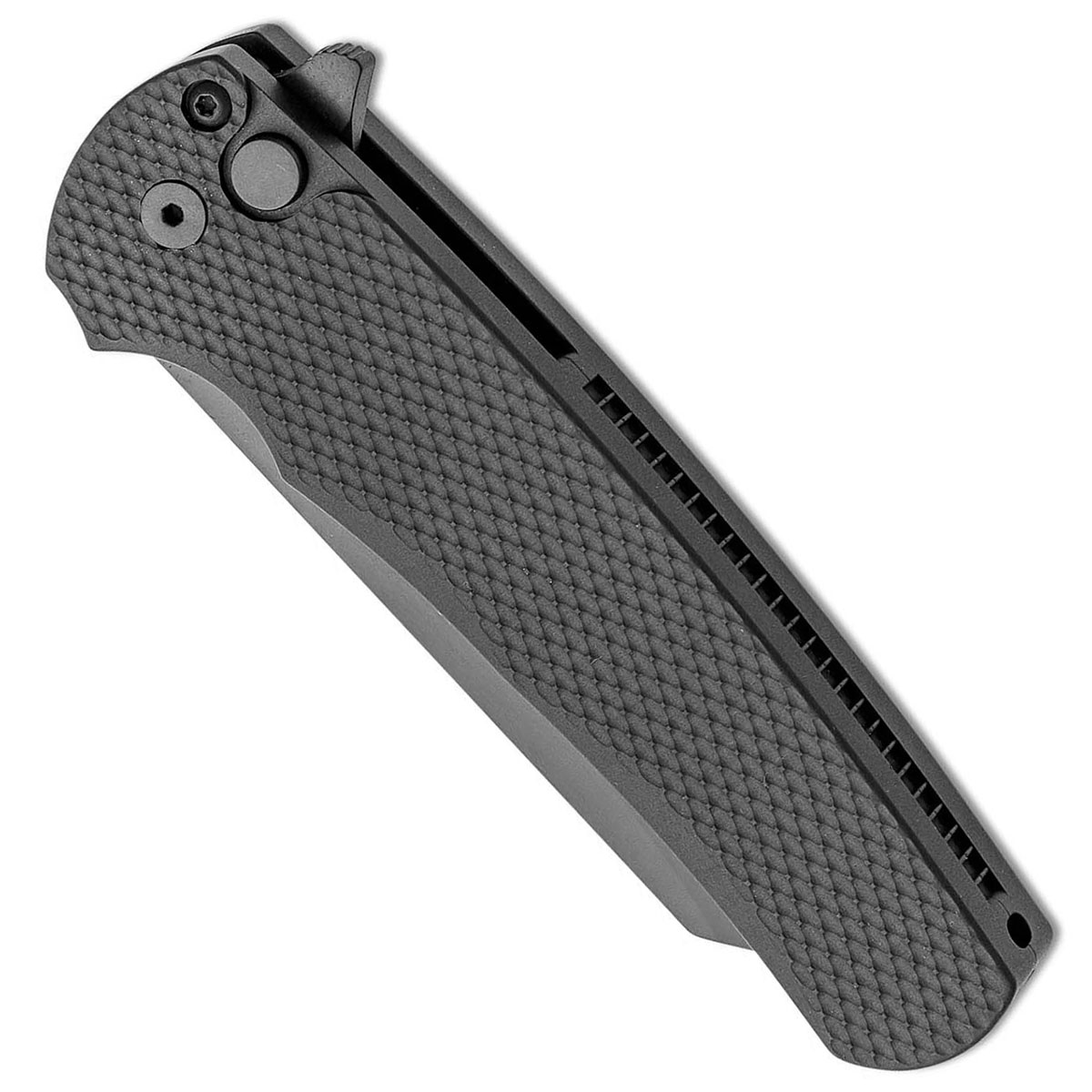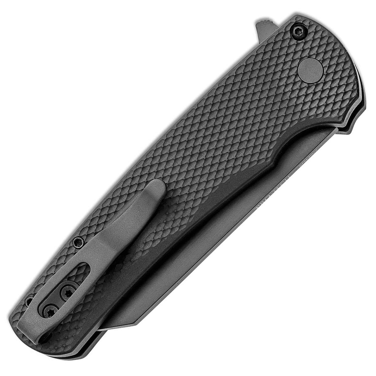 This model features textured black anodized 7075 aluminum handle scales. Black DLC finished CPM-20CV stainless steel reverse tanto blade. Black DLC finished hardware and pocket clip for tip up carry. Brand new in box.