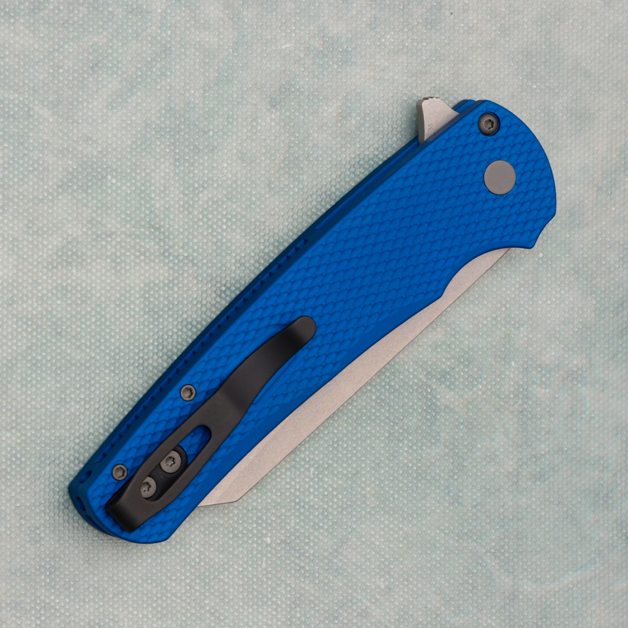This model features textured blue anodized 7075 aluminum handle scales. Stonewash finished CPM-20CV stainless steel reverse tanto blade. Black finished hardware and pocket clip for tip up carry. Like new in box.