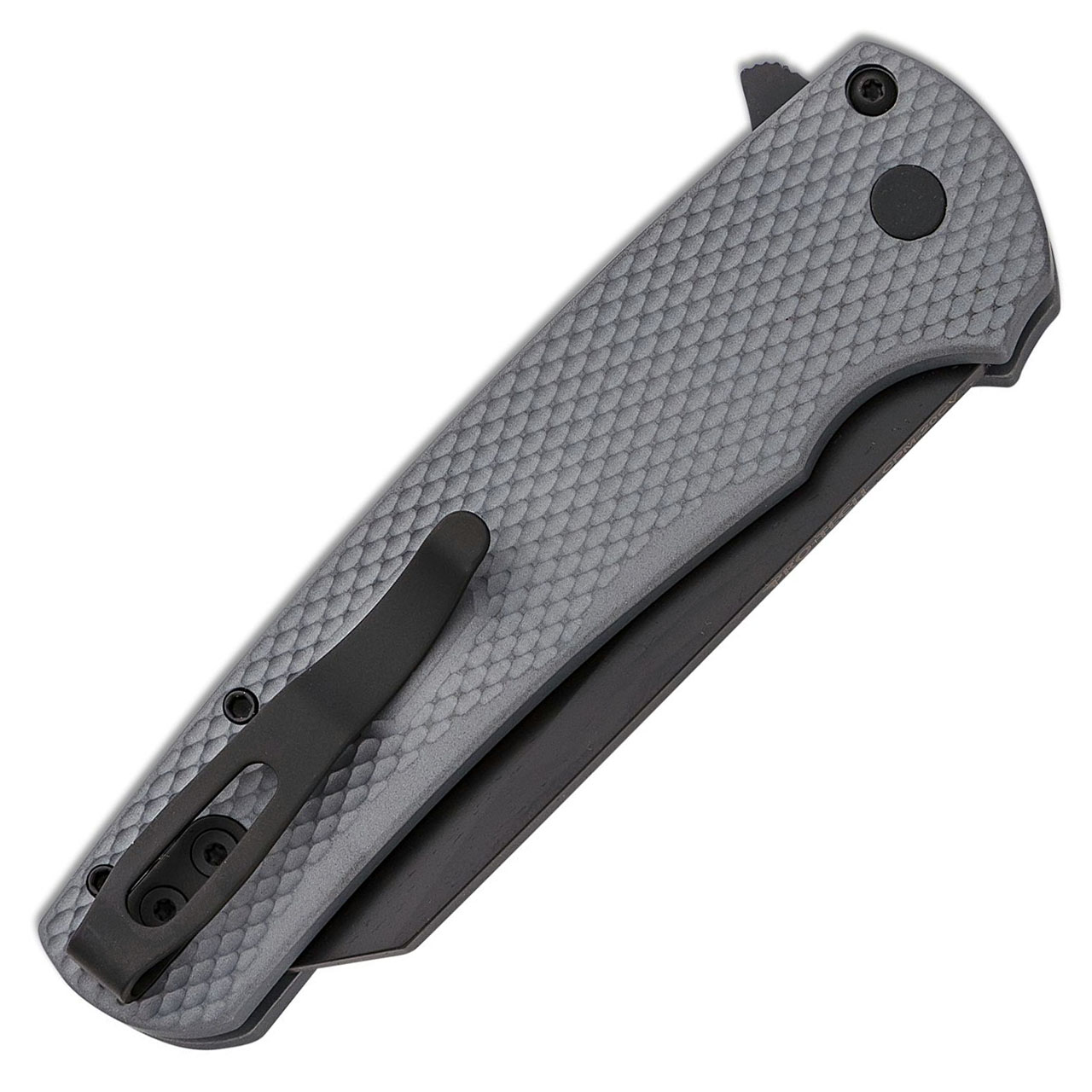 This model features textured grey anodized 7075 aluminum handle scales. Black DLC finished CPM-20CV stainless steel reverse tanto blade. Black DLC finished hardware and pocket clip for tip up carry. Brand new in box.