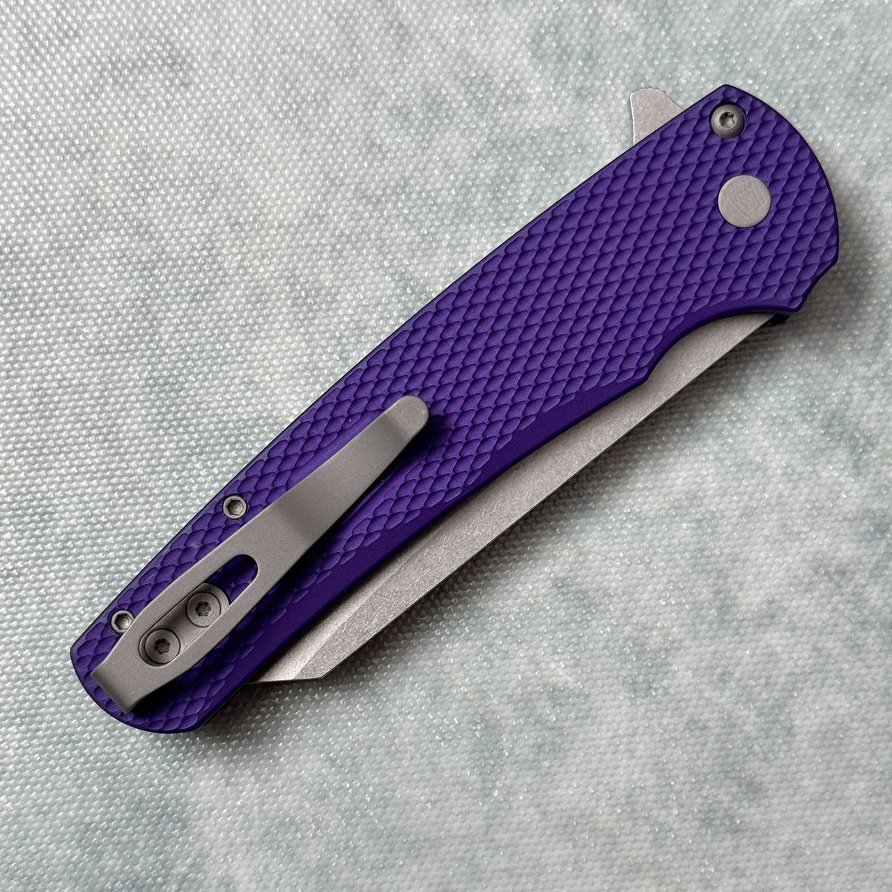 This model features textured purple anodized 7075 aluminum handle scales. Stonewash finished CPM-20CV reverse tanto blade. Bead blast finished hardware and pocket clip for tip up carry. Brand new in box.