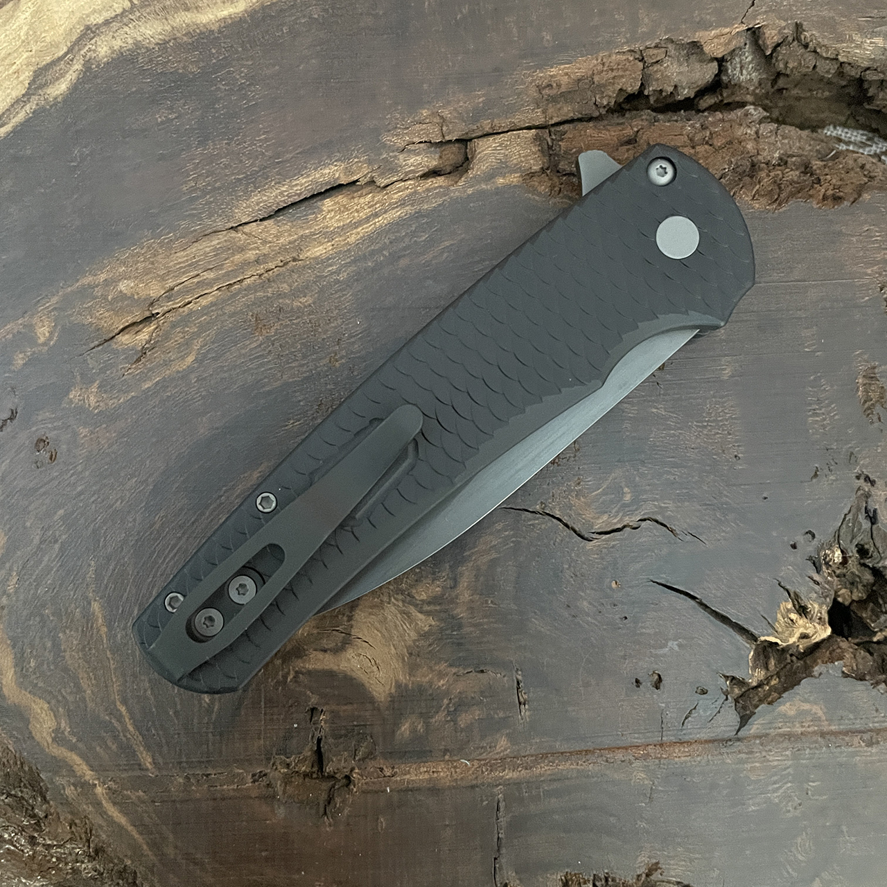 This model features Black Dragonscale aluminum handle scales. Smokey Grey DLC finished CPM-MagnaCut stainless steel wharncliffe blade. Bead blast finished hardware and black pocket clip for tip up carry. Brand new in box.